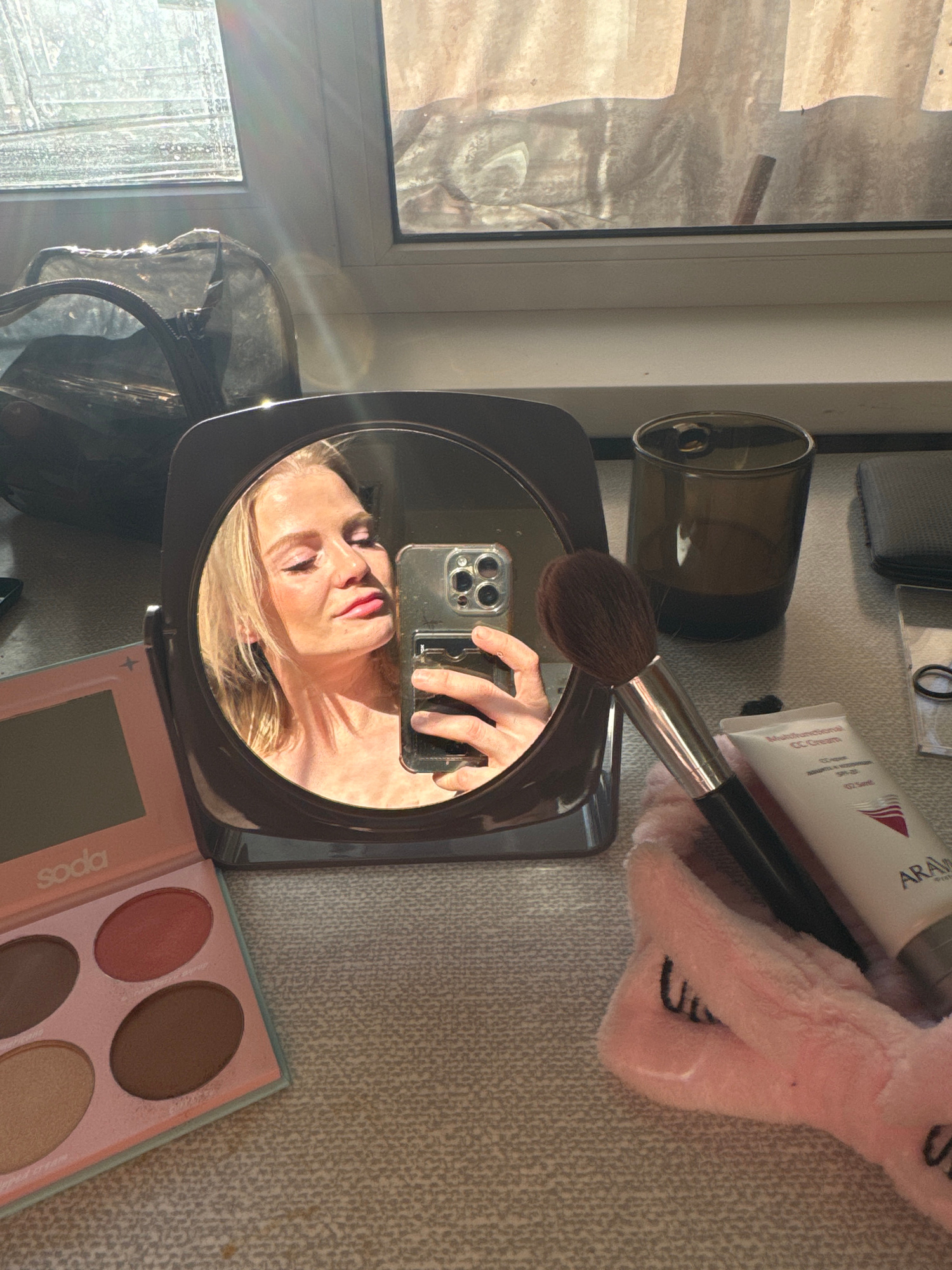 A woman's reflection appears in a small makeup mirror, held by her left hand. The camera is a modern smartphone. The surrounding objects suggest a personal grooming or makeup application context. Thes…read more