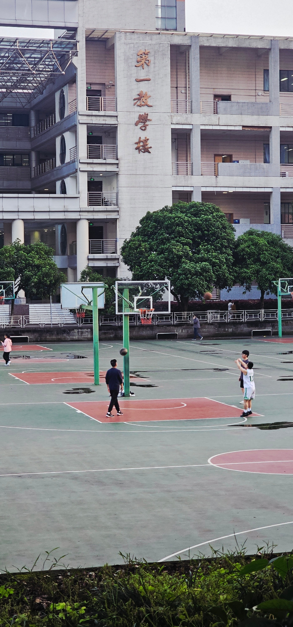 A horizontally oriented, medium-angle, full outdoor shot depicts a basketball court located next to a tall building. The building, situated on the left side of the image, features a facade with Chines…read more