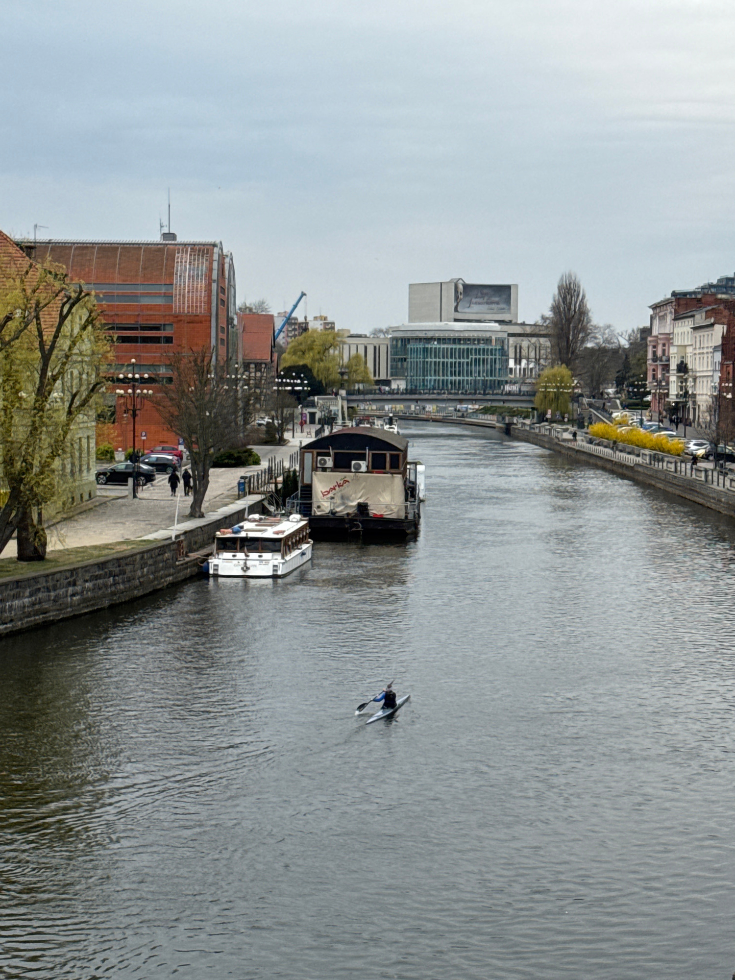 The image depicts a view of the Brda River in Bydgoszcz, Poland, on an overcast day. Buildings line the left bank, including a modern glass structure and an older brick building. A pedestrian walkway…read more