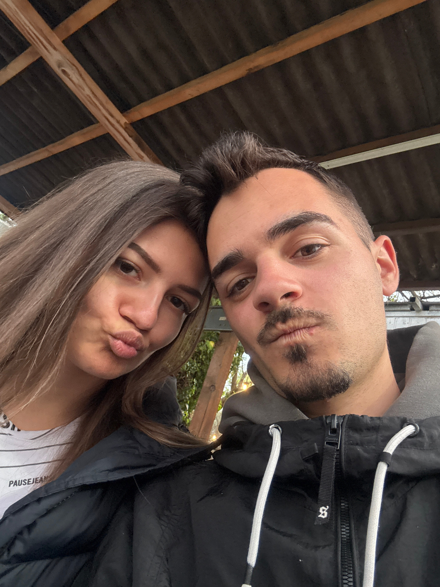 A tilted close-up selfie shows a young man and woman looking directly at the camera, both making a "duck face" expression. The man is positioned above and slightly behind the woman. The man has short…read more