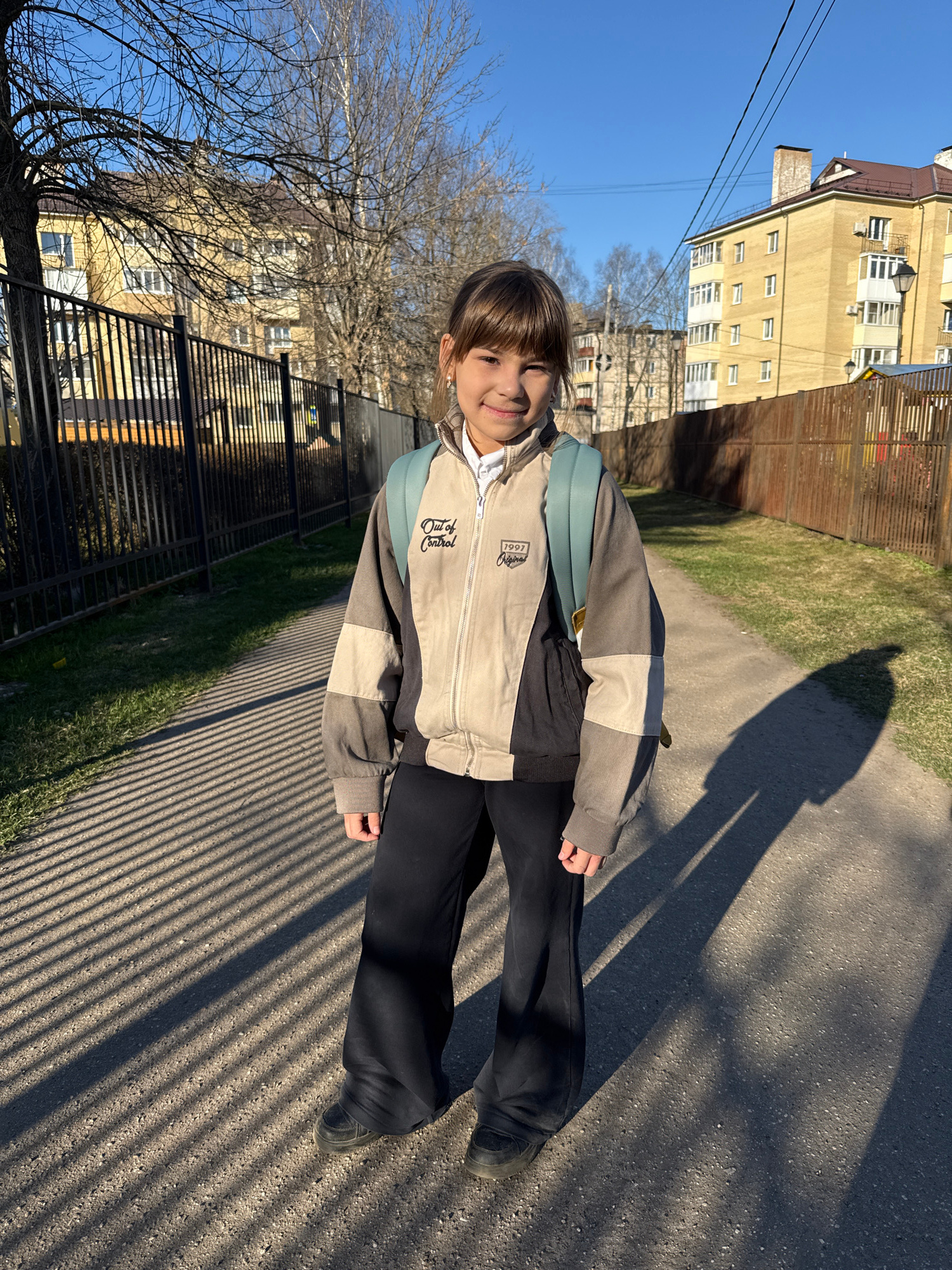 The image, taken in Zhukovo, Russia, shows a cheerful young person smiling towards the camera. The individual has light brown hair and is standing on a paved path or sidewalk. They are dressed in a di…read more