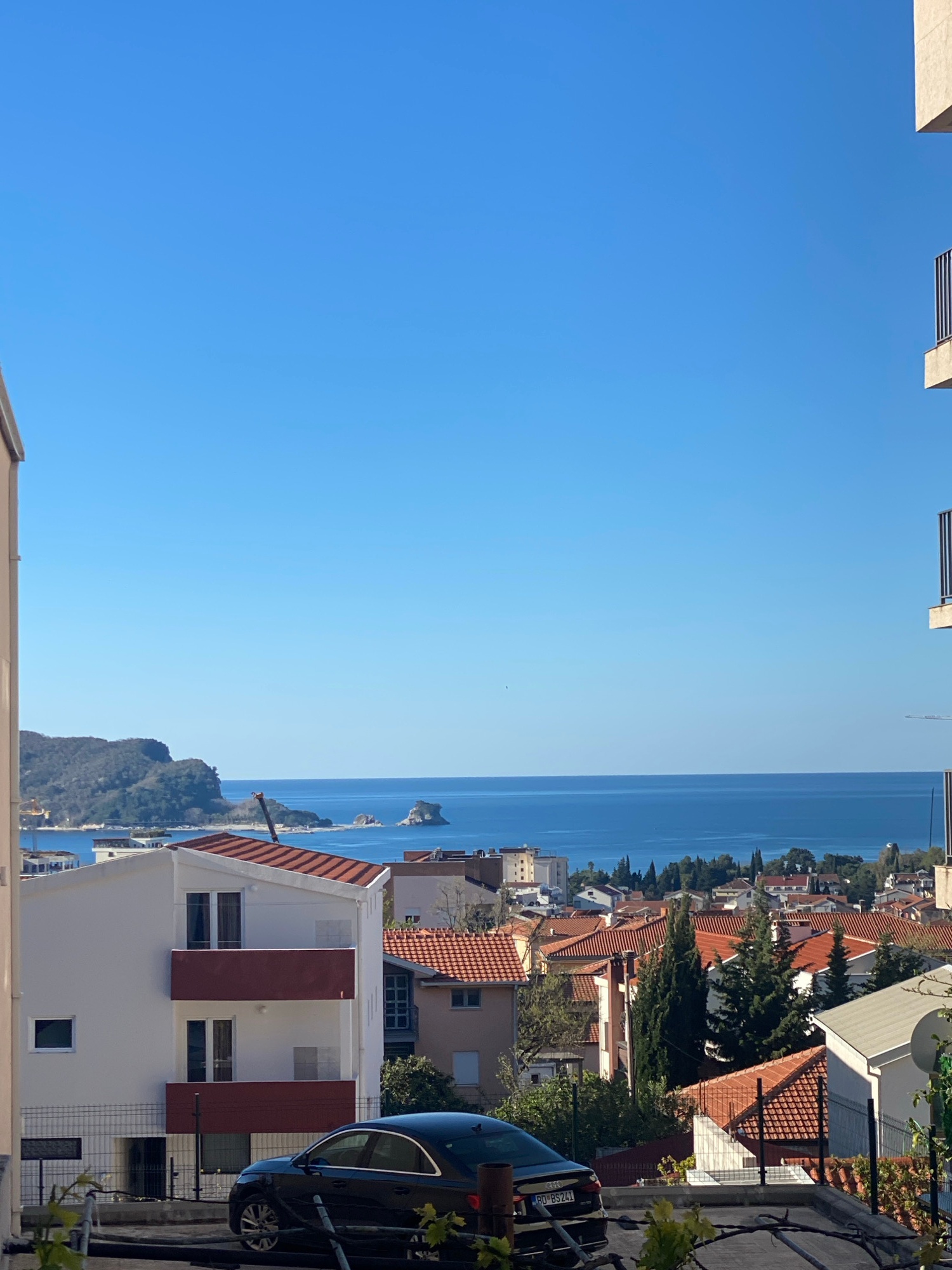 The image shows a view of Budva, Montenegro, from an elevated perspective. The Adriatic Sea stretches towards the horizon, with several small islands visible in the distance. The foreground is dominat…read more