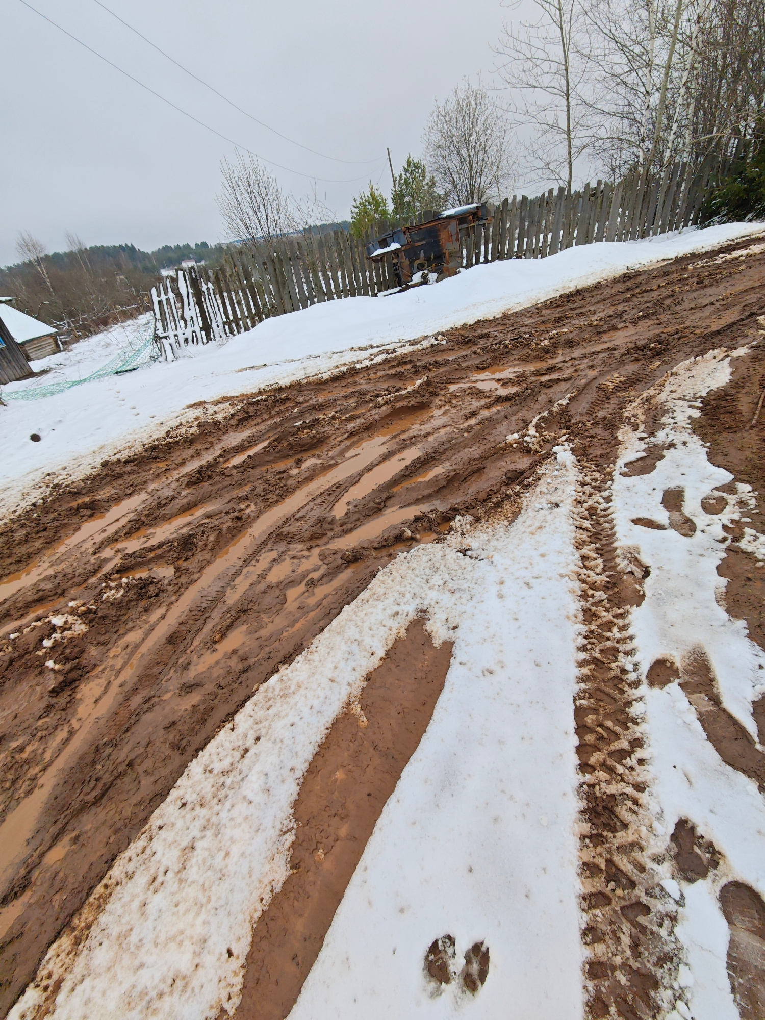 The image shows a muddy and snowy road in a rural area, likely in Markovo, Russia. The road is heavily rutted with tire tracks and footprints, indicating recent vehicle and pedestrian traffic. Patches…read more