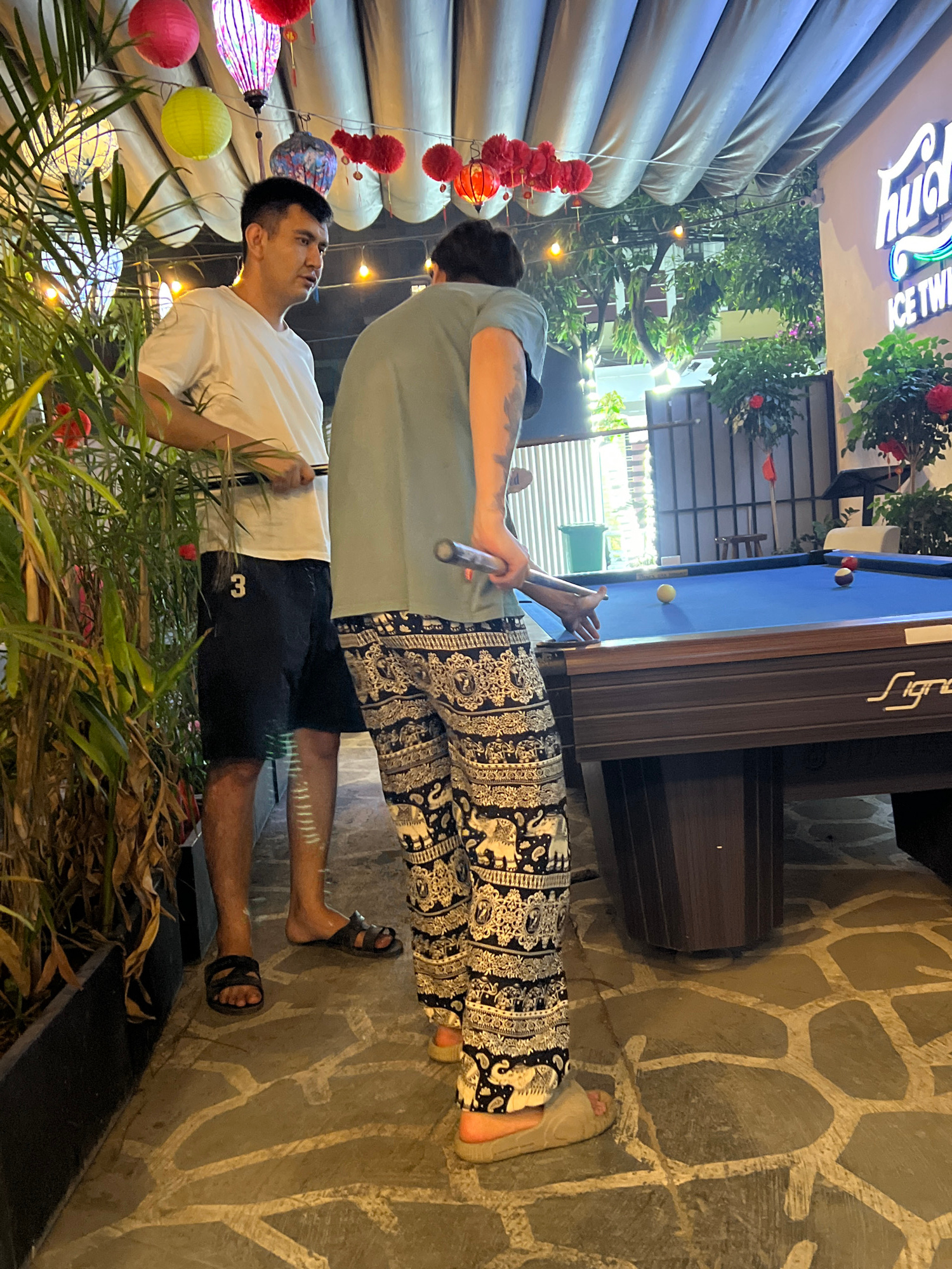 The image captures two men engaged in a game of billiards at what appears to be an indoor or semi-outdoor entertainment venue at night, likely in Đà Nẵng, Vietnam. In the foreground, one man is activ…read more