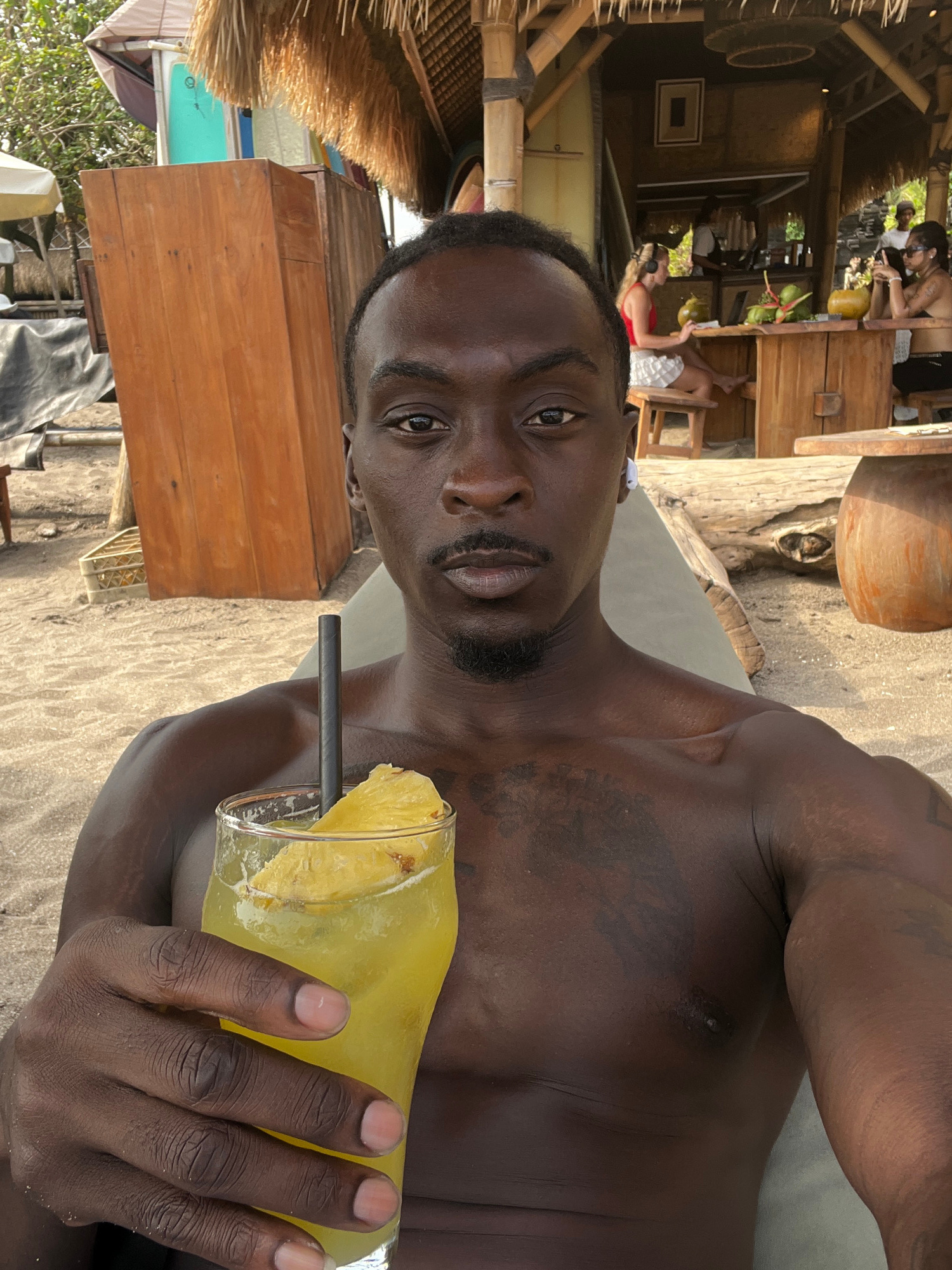 A medium shot depicts a man holding a glass with a yellow drink, potentially a pineapple-based beverage due to the visible pineapple slices. He is shirtless, revealing dark skin and tattoos on his cheβ¦read more