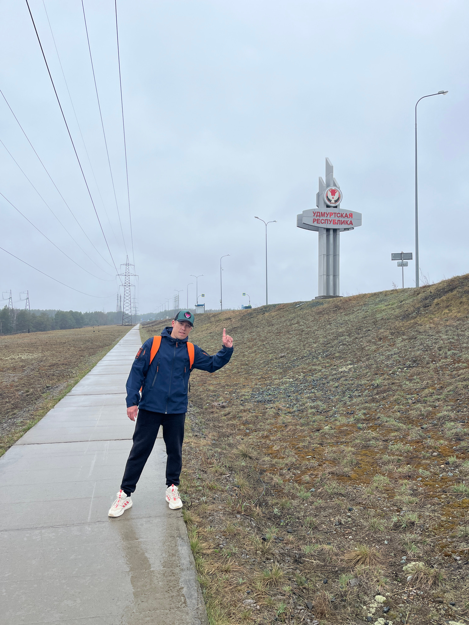 A full-body shot captures a man posing on a wet concrete path beside a roadside monument under an overcast sky. He is dressed in a dark blue jacket with bright orange accents, black pants, and light-c…read more