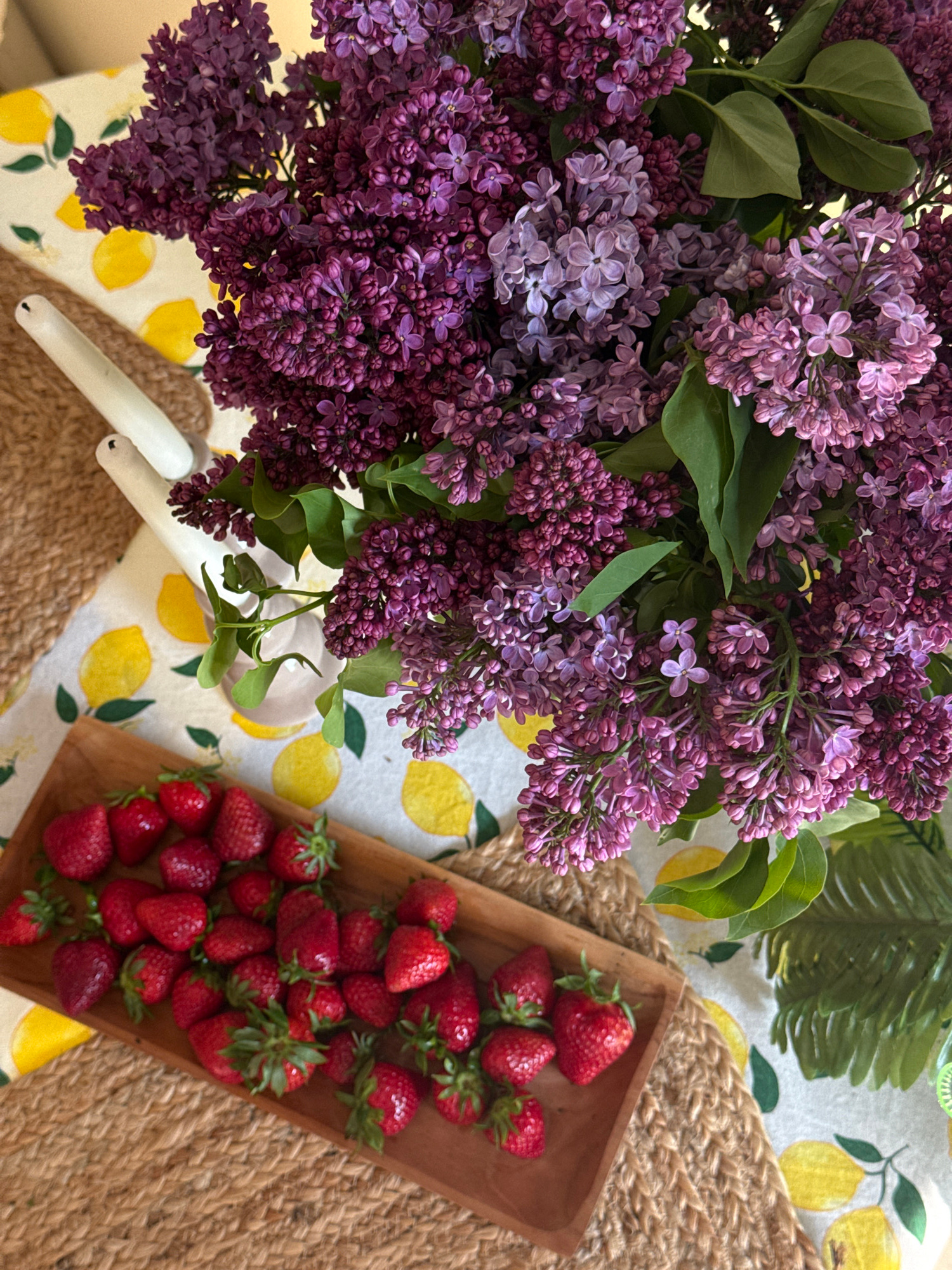 This top-down image captures a fresh and vibrant still life arrangement set on a table. The primary subject is a large, lush bouquet of purple lilacs, displaying various shades from deep violet buds t…read more