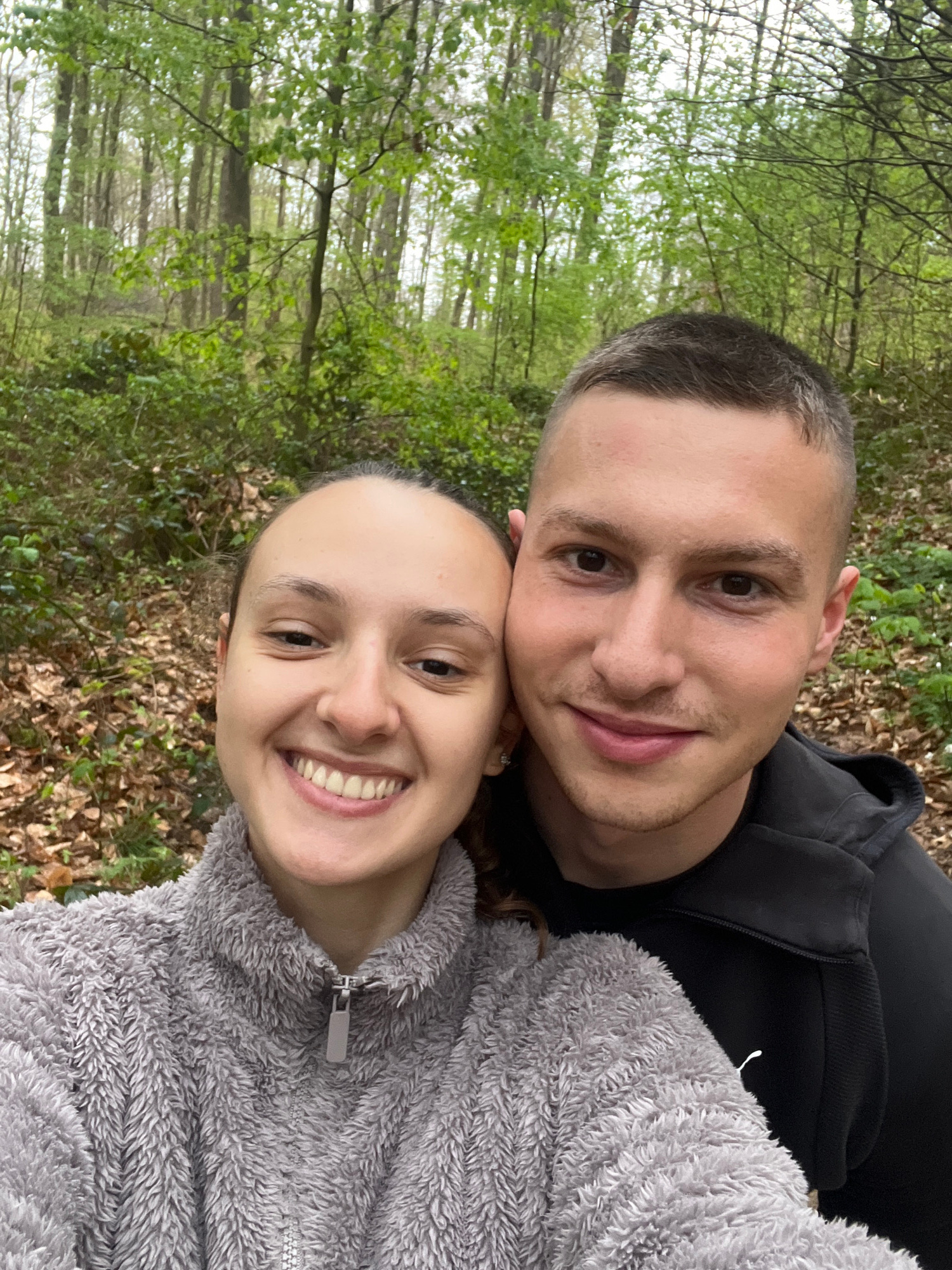 A selfie depicts a couple in a wooded area. The man is wearing a black hooded sweatshirt and has short hair. The woman is wearing a gray fleece jacket. The background reveals a forest setting with tre…read more