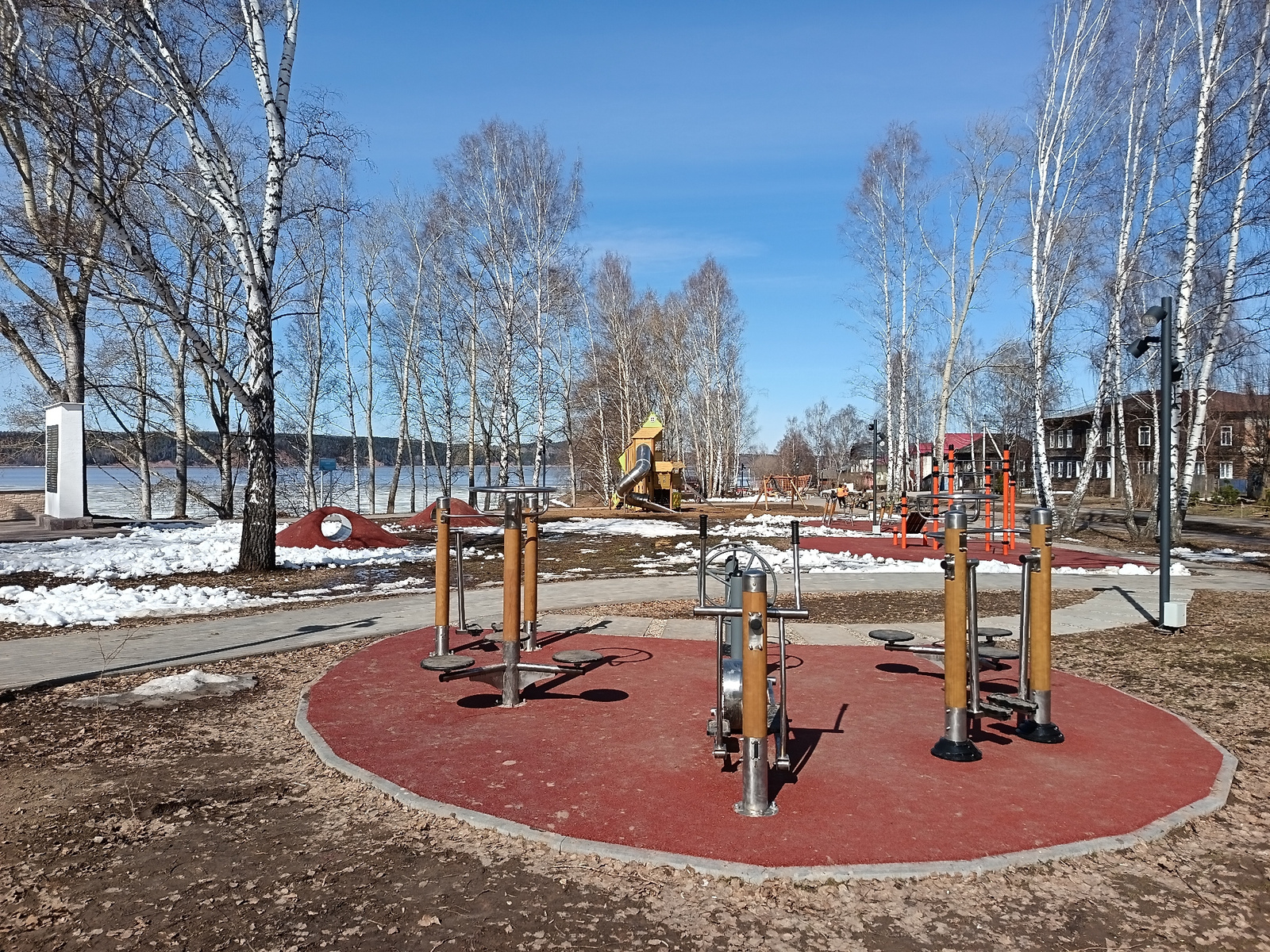 The image shows a public park in Osa, Russia. It is early spring, as evidenced by the melting snow and bare trees. There are outdoor fitness equipment on a red rubberized surface in the foreground. In…read more