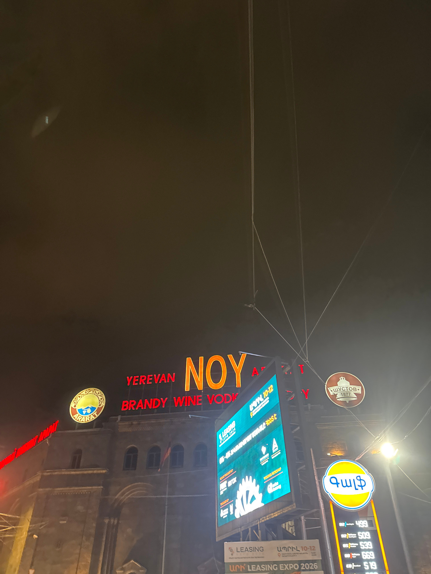 The image shows a nighttime street scene in Yerevan, Armenia, dominated by several illuminated advertising signs. Prominently featured is a large red sign advertising "Yerevan Noy Brandy Wine Vodka."…read more