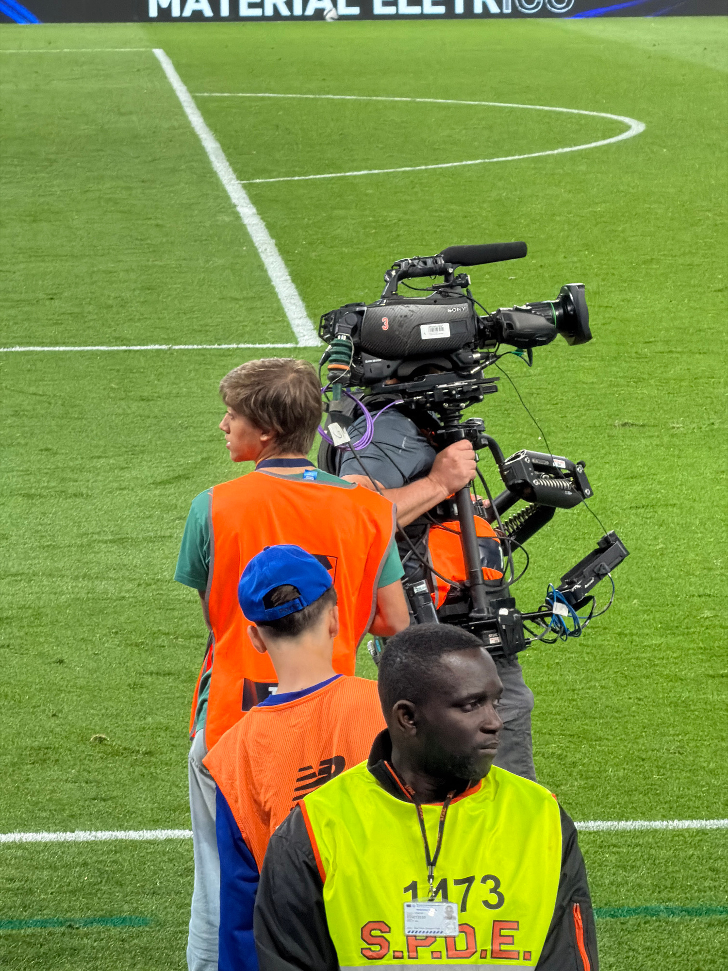 The image shows three individuals and a broadcast camera on a grassy field. Two of the individuals are wearing high-visibility vests, one yellow and one orange. The camera operator, whose hand is visi…read more