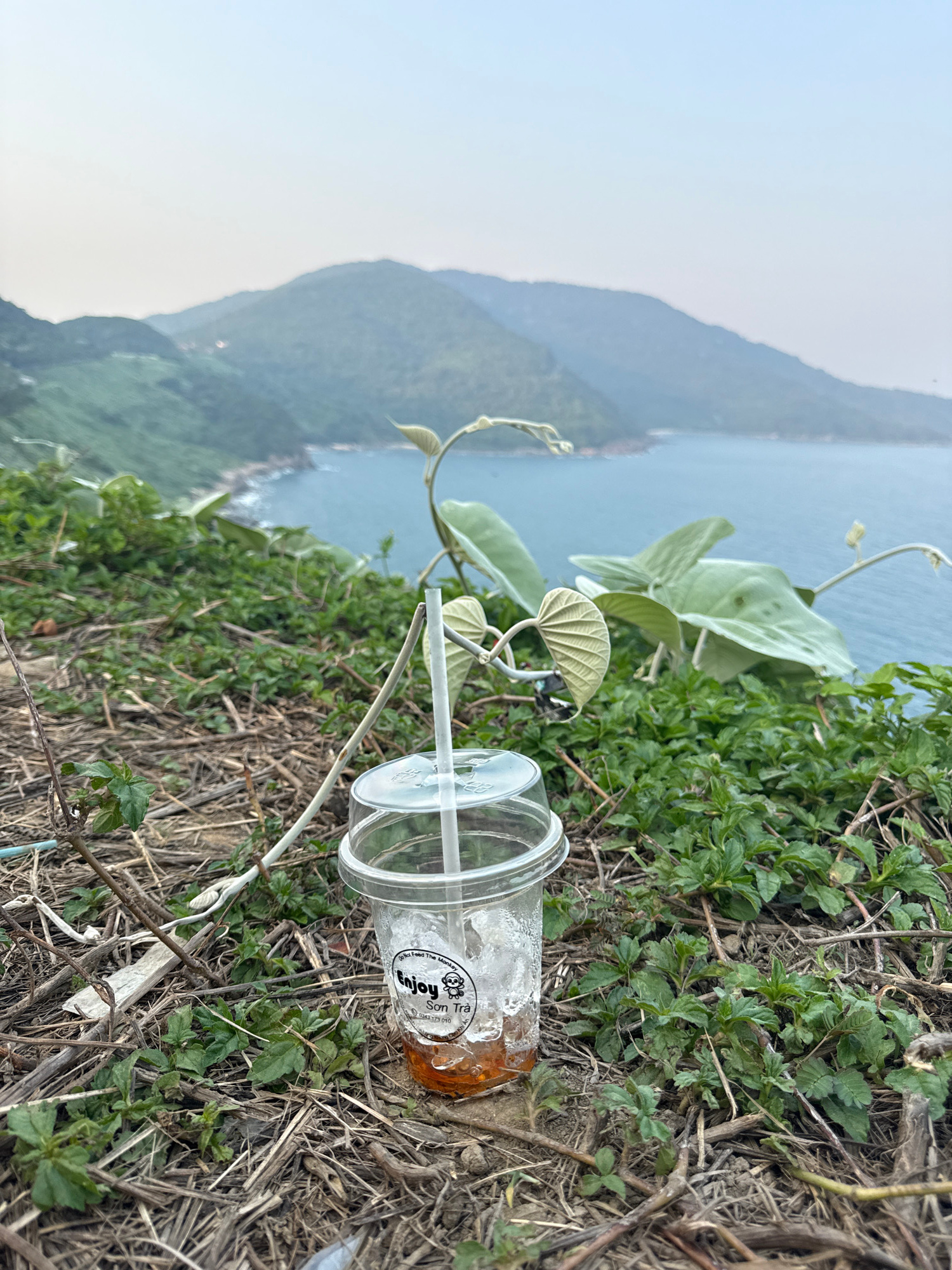A clear plastic cup with a straw sits on the ground among vegetation, overlooking the city of Đà Nẵng, Vietnam. The cup contains a small amount of liquid and ice. Mountains are visible in the backgrou…read more