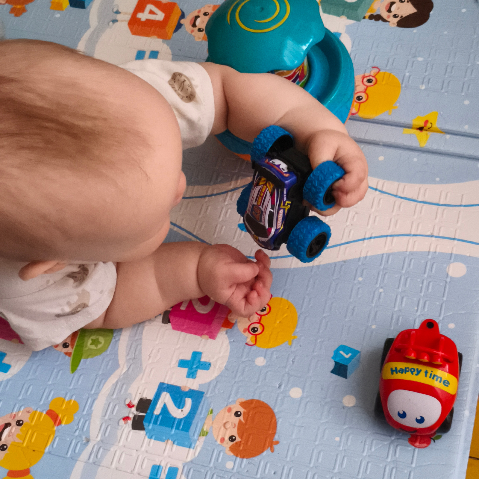A baby lies on a padded play mat with colorful designs in a room in Chaikovsky, Russia. The baby wears a white diaper with animal prints and is surrounded by several toys, including a blue and black t…read more