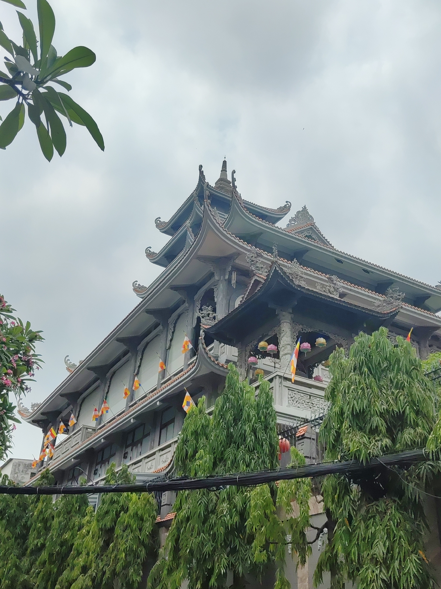 The image depicts a multi-tiered building in Thủ Đức, Vietnam, against an overcast sky. The architecture features ornate, upturned eaves and a pagoda-like structure. Flags are hanging from the buildin…read more