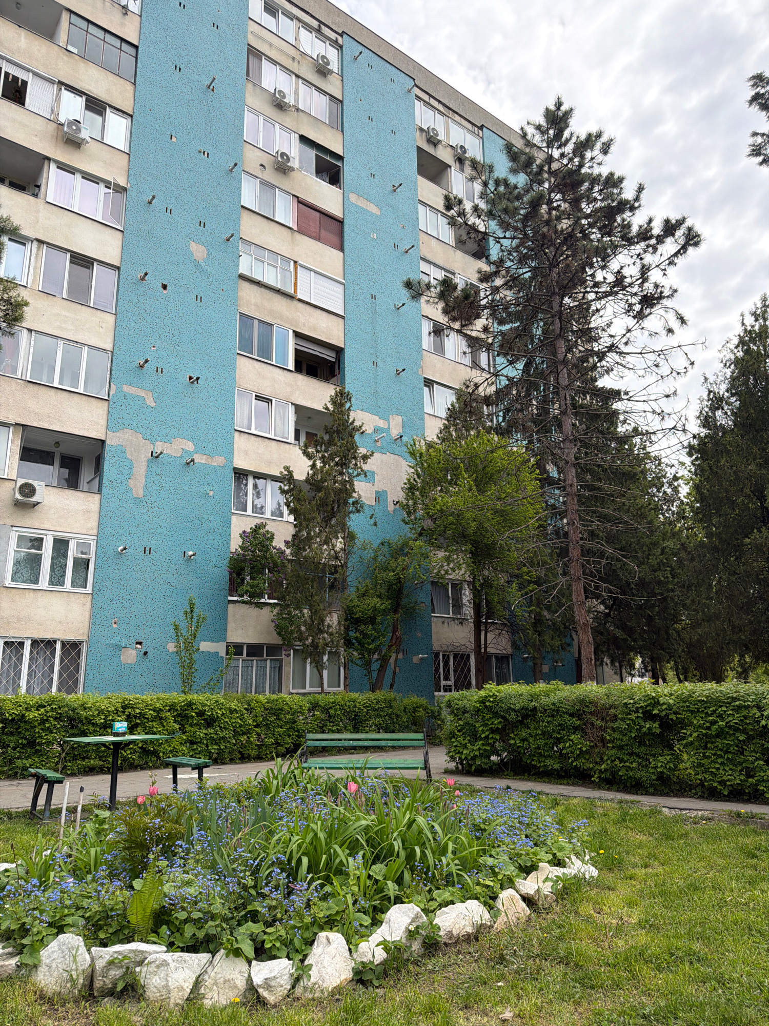 The image shows the facade of a residential building in Târgu Mureș, Romania. The building has a repeating pattern of windows and light-colored panels, interspersed with turquoise sections covered in…read more