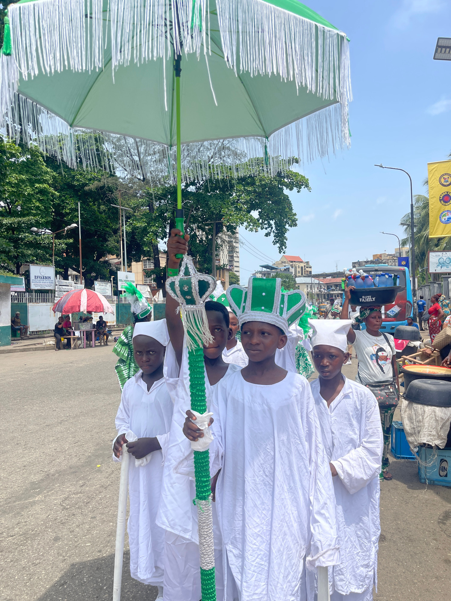Four boys are dressed in white robes and white hats, with green and white trim, on a street. One of the boys is holding a large green and white umbrella and another is holding a green and white staff.…read more
