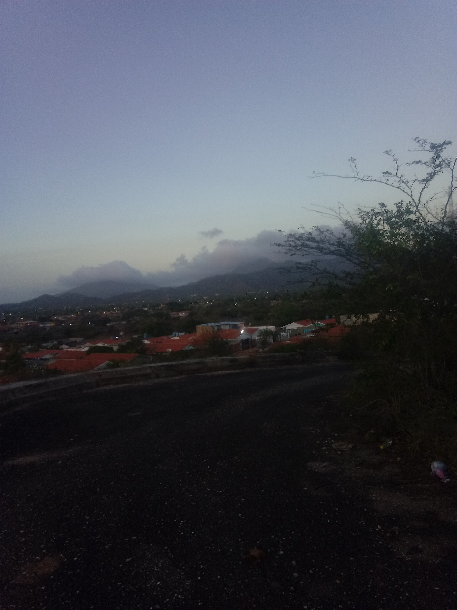 The image depicts a street view in Juan Griego, Venezuela, at dusk or dawn. Mountains are visible in the background, partially obscured by clouds. Below the mountains is a residential area with red-ti…read more