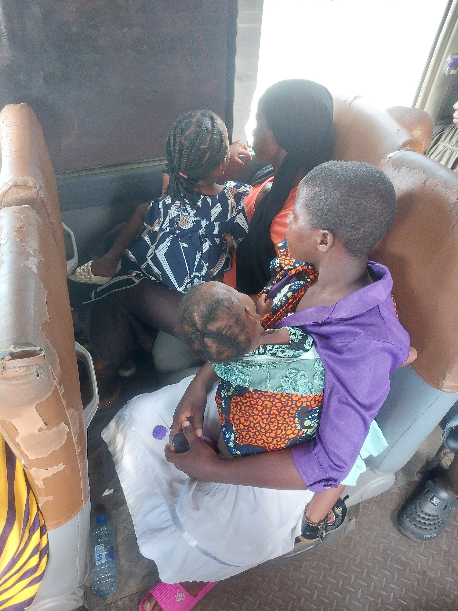The image shows a group of four people inside what appears to be a vehicle, possibly a bus or a van. One woman wearing a black hijab is seated next to a child with braided hair. Next to them, a woman…read more