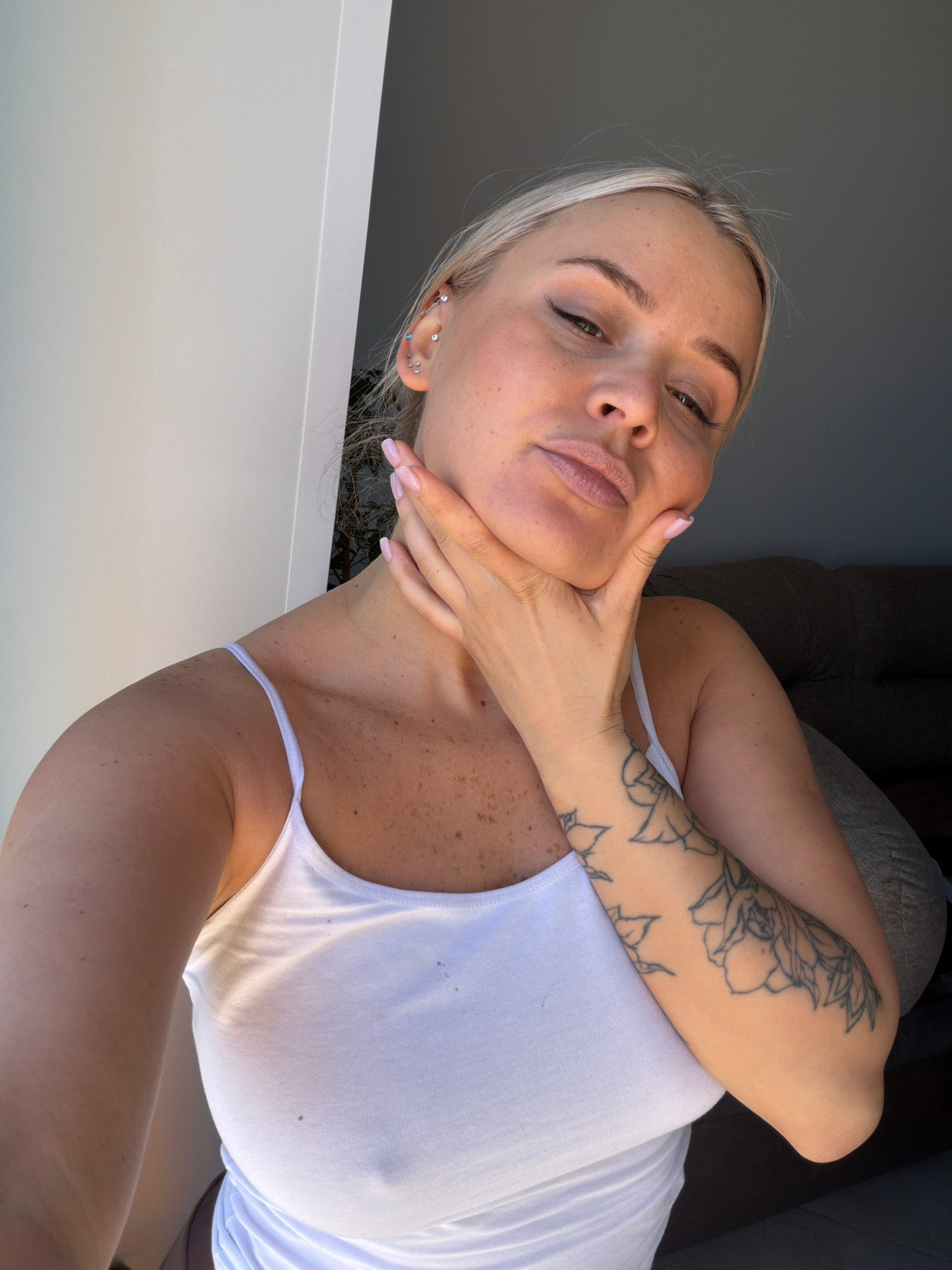 A light-skinned individual with blonde hair, likely female, is captured in a close-up selfie, oriented diagonally in the frame. She wears a plain white tank top, through which one nipple is visible. H…read more