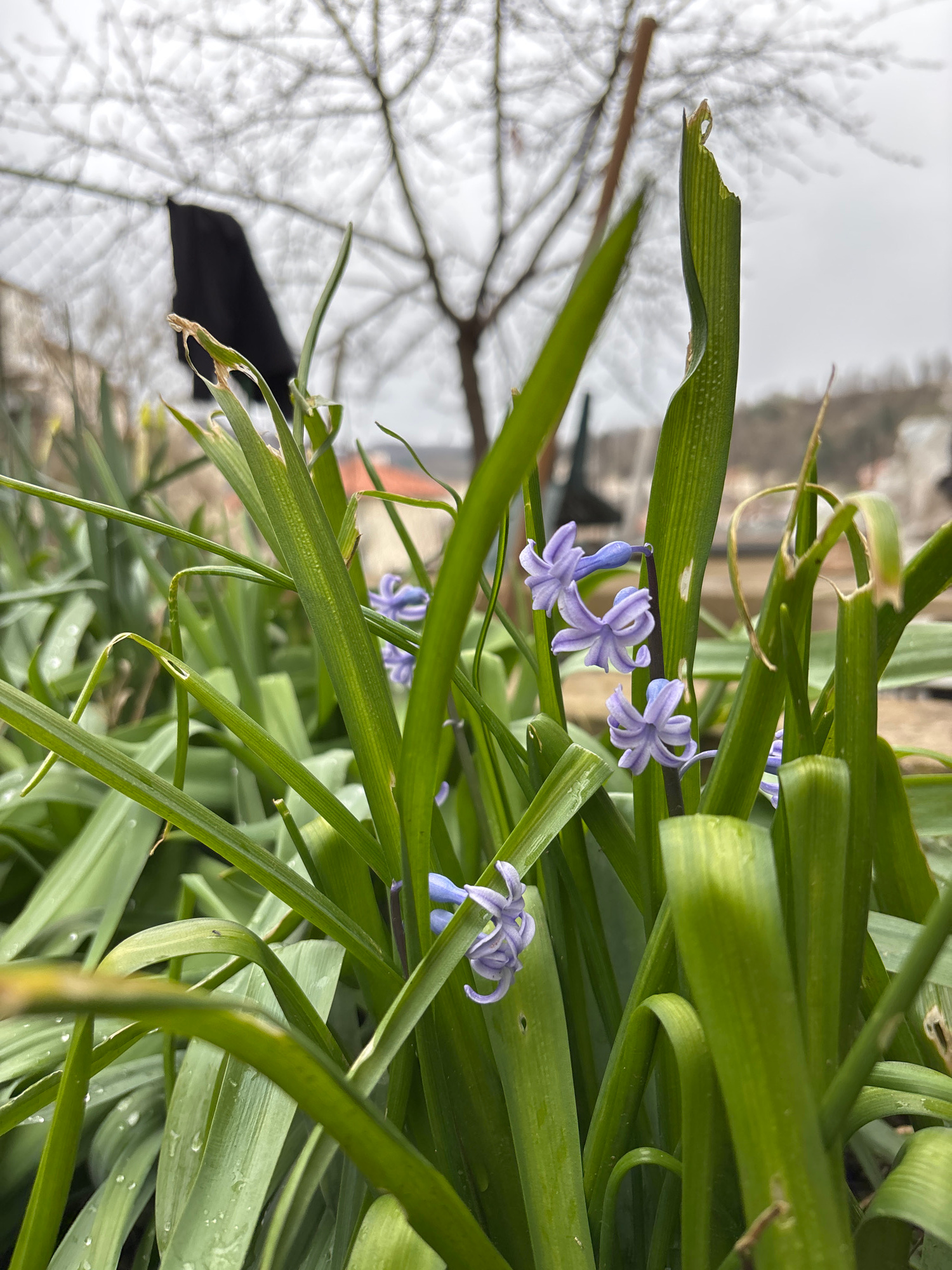 The image depicts a ground-level, shallow depth-of-field view of early spring flora in Zlatograd, Bulgaria, under an overcast sky. The immediate foreground features a dense growth of vibrant green, st…read more