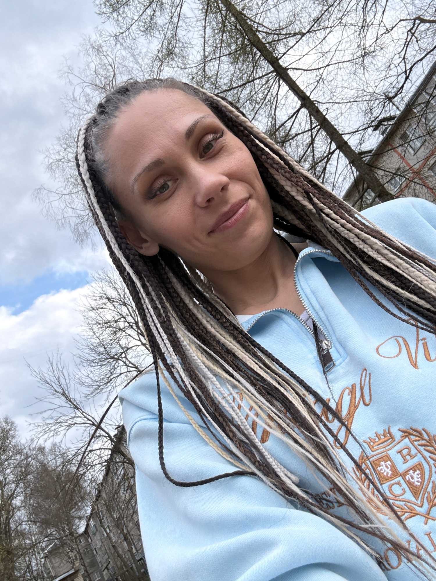 A woman takes a low-angle selfie outdoors. She looks down into the camera with a subtle smirk or neutral expression. Her hair is styled in numerous long dreadlocks or braids, which are a prominent fea…read more
