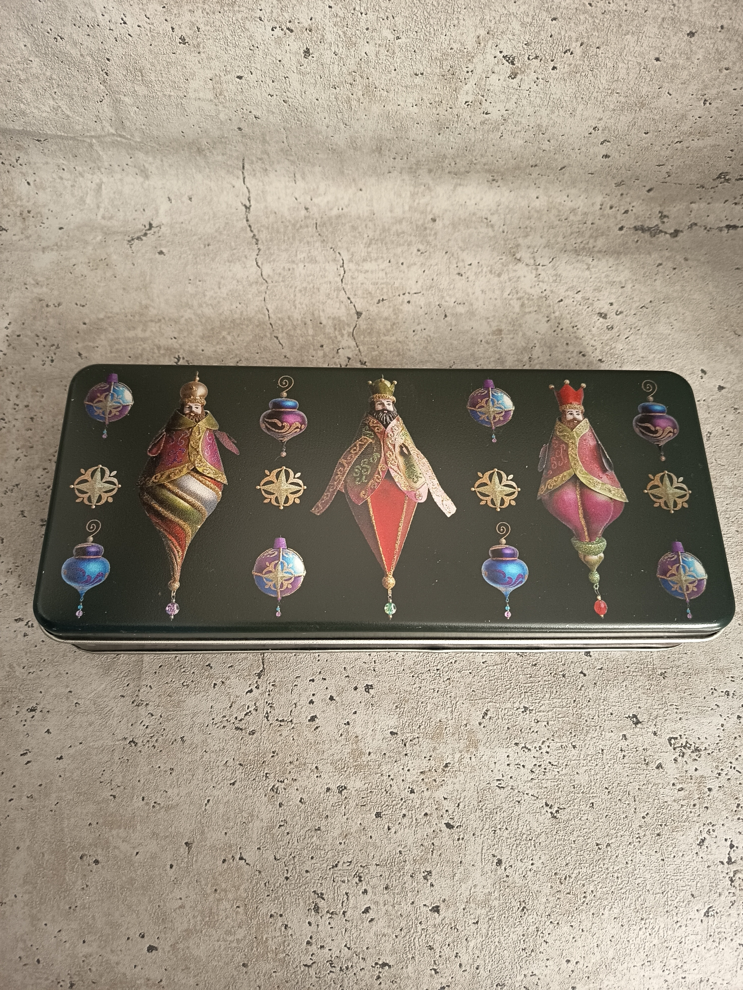 The image shows a rectangular tin box with a black background and a decorative design. The design features stylized figures resembling the Three Wise Men, interspersed with ornament and snowflake-like…read more