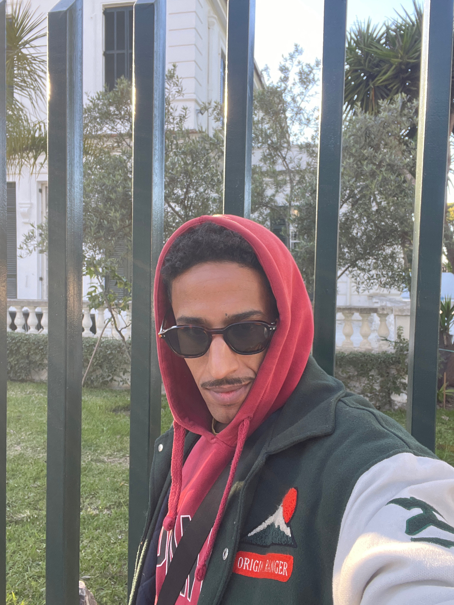 A person wearing a red hooded sweatshirt, sunglasses, and a dark green jacket with the words "ORIGIN RANGER" on it is positioned behind a dark green metal fence. The background includes buildings, treβ¦read more