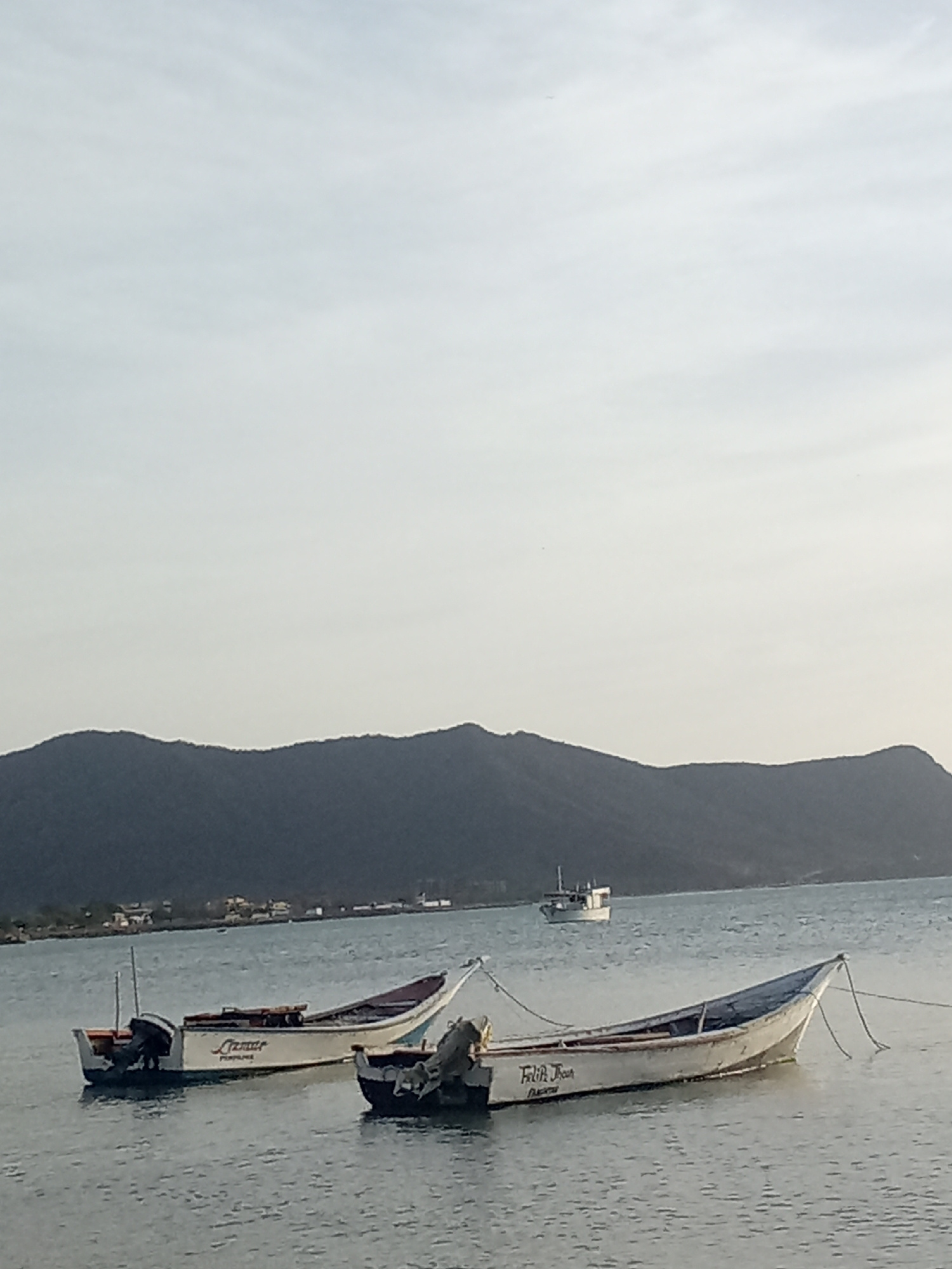 The image depicts a seascape with two small, white fishing boats anchored in the foreground. One boat has the word "Lamar" inscribed on its side, and the other has "Felik Joan." Both have outboard mot…read more