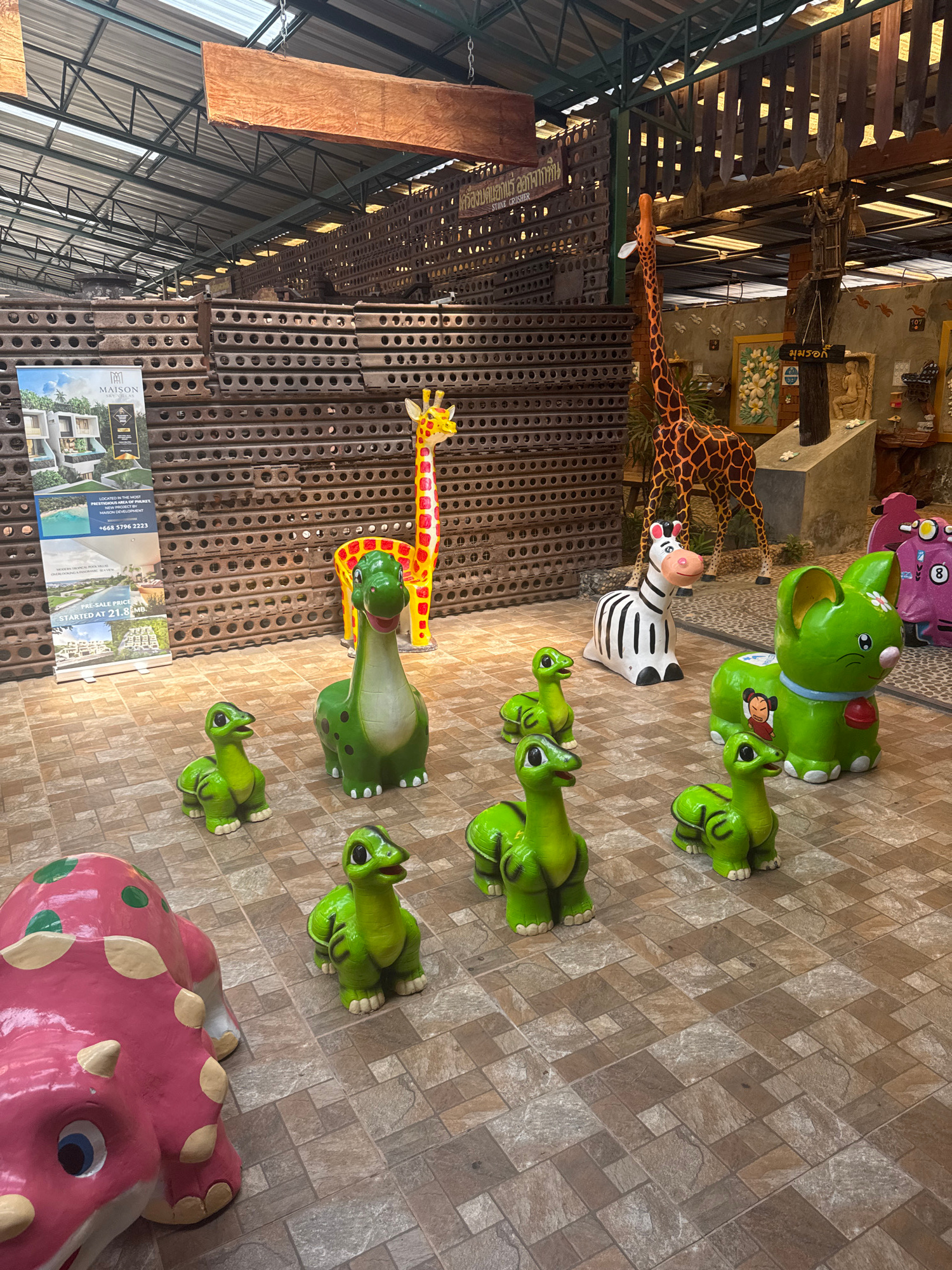 The image shows a collection of colorful animal statues in what appears to be a store or warehouse setting in Ban Khlong Khian, Thailand. The statues include giraffes, zebras, elephants, dinosaurs, an…read more