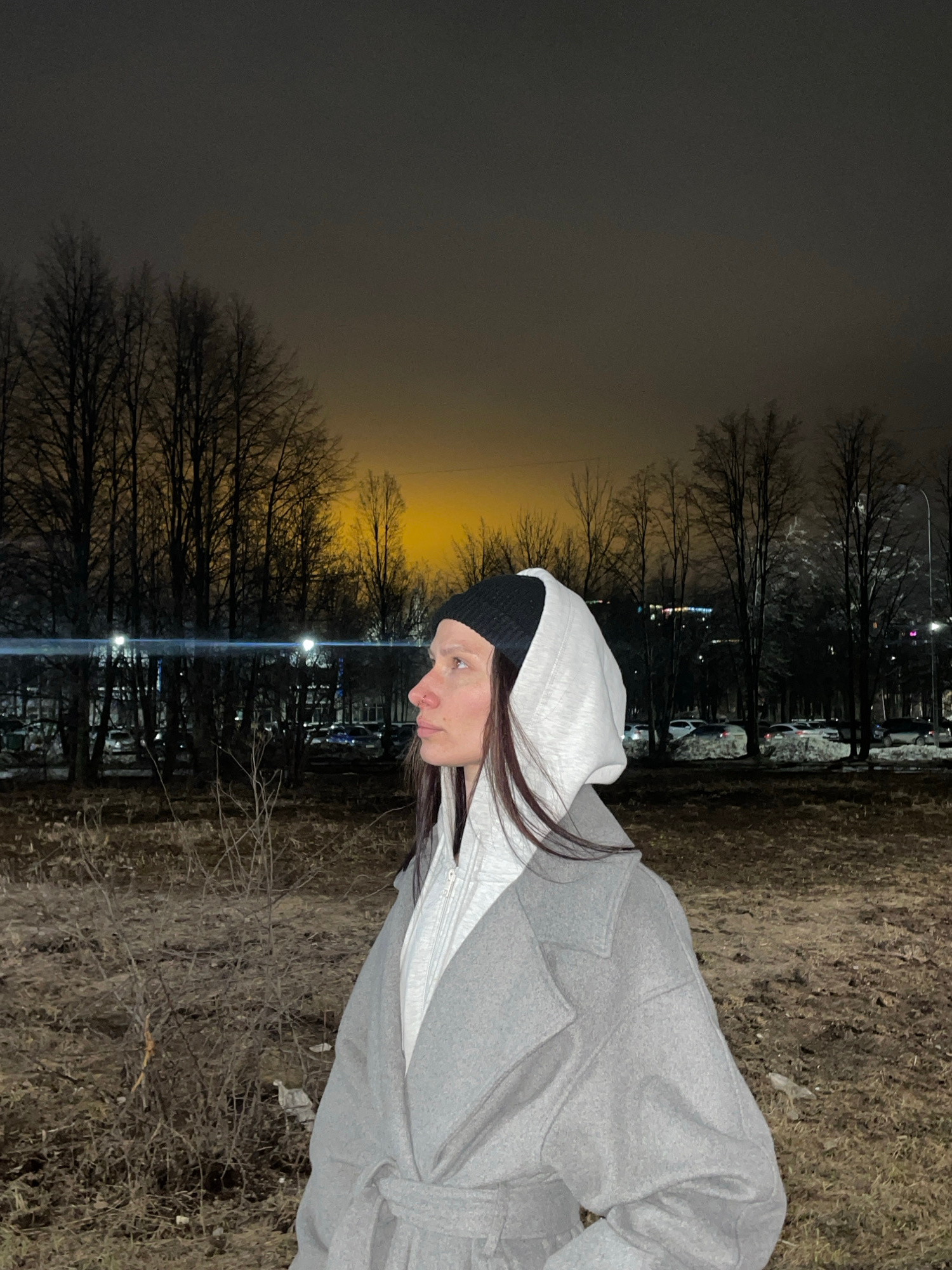A woman wearing a gray coat with a hood and a black beanie stands outside at night. The location appears to be a park or wooded area in Izhevsk, Russia, with bare trees and sparse vegetation. In the b…read more