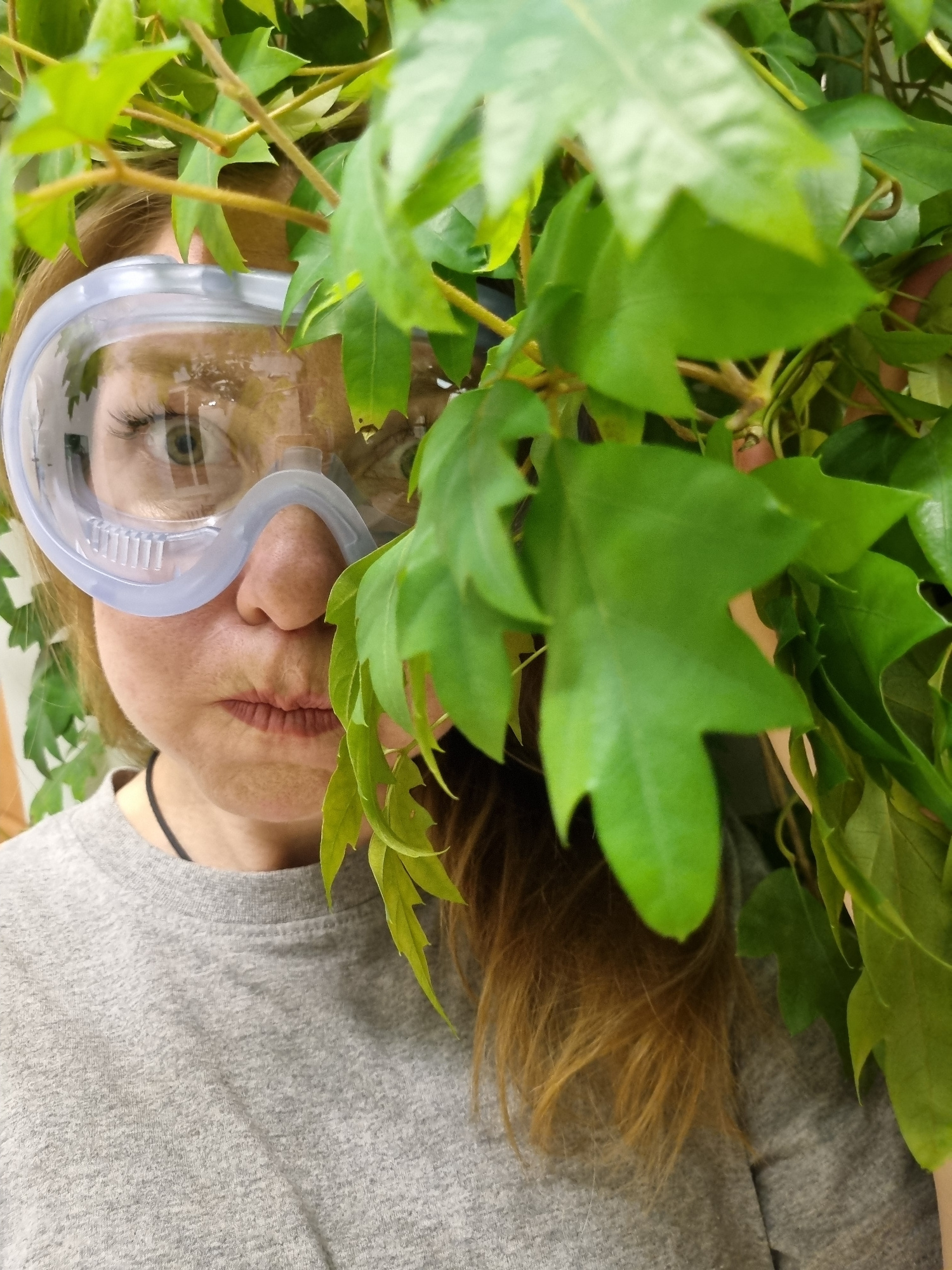 A person with light skin, brown hair, wearing a gray shirt, and safety goggles is obscured by green foliage, likely ivy. The location is unknown.