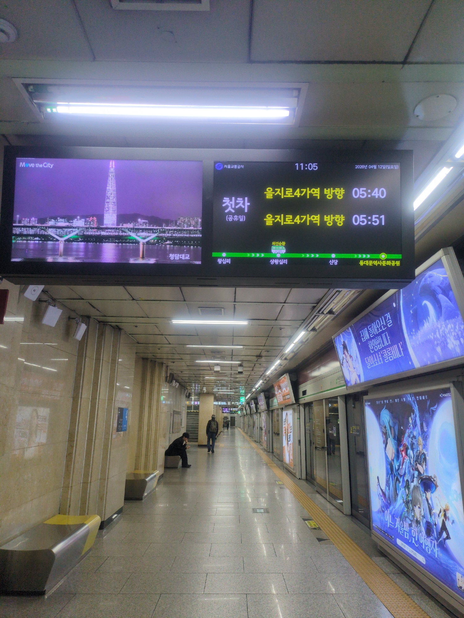 Here's a detailed description of the image: **Setting:** An underground subway station in Seoul, South Korea. The station appears clean and well-maintained with light-colored tile flooring and walls.…read more