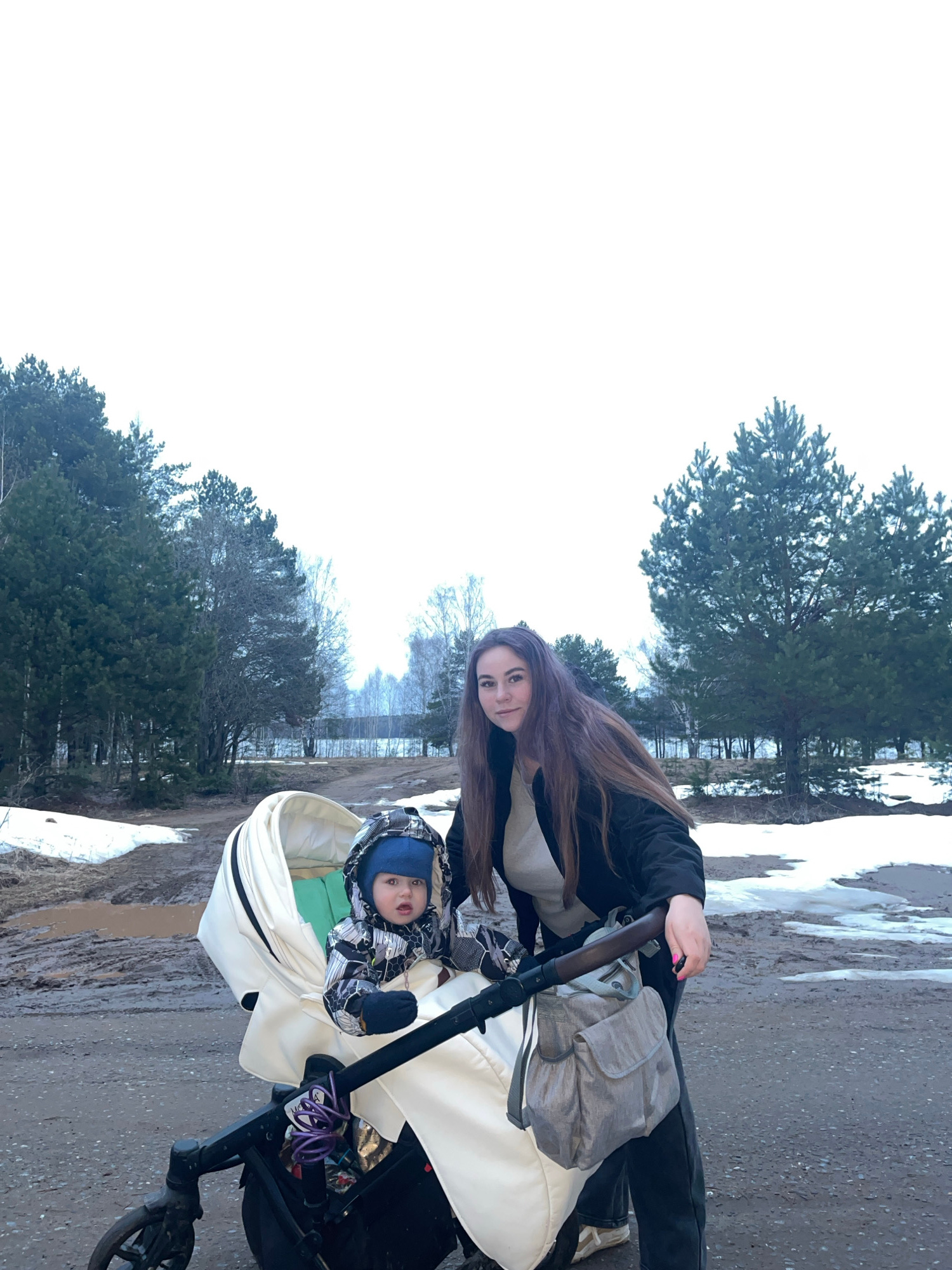 A woman stands beside a baby in a stroller in Chaikovsky, Russia. The stroller is positioned on a muddy path. Trees are visible in the background. There are patches of snow on the ground.