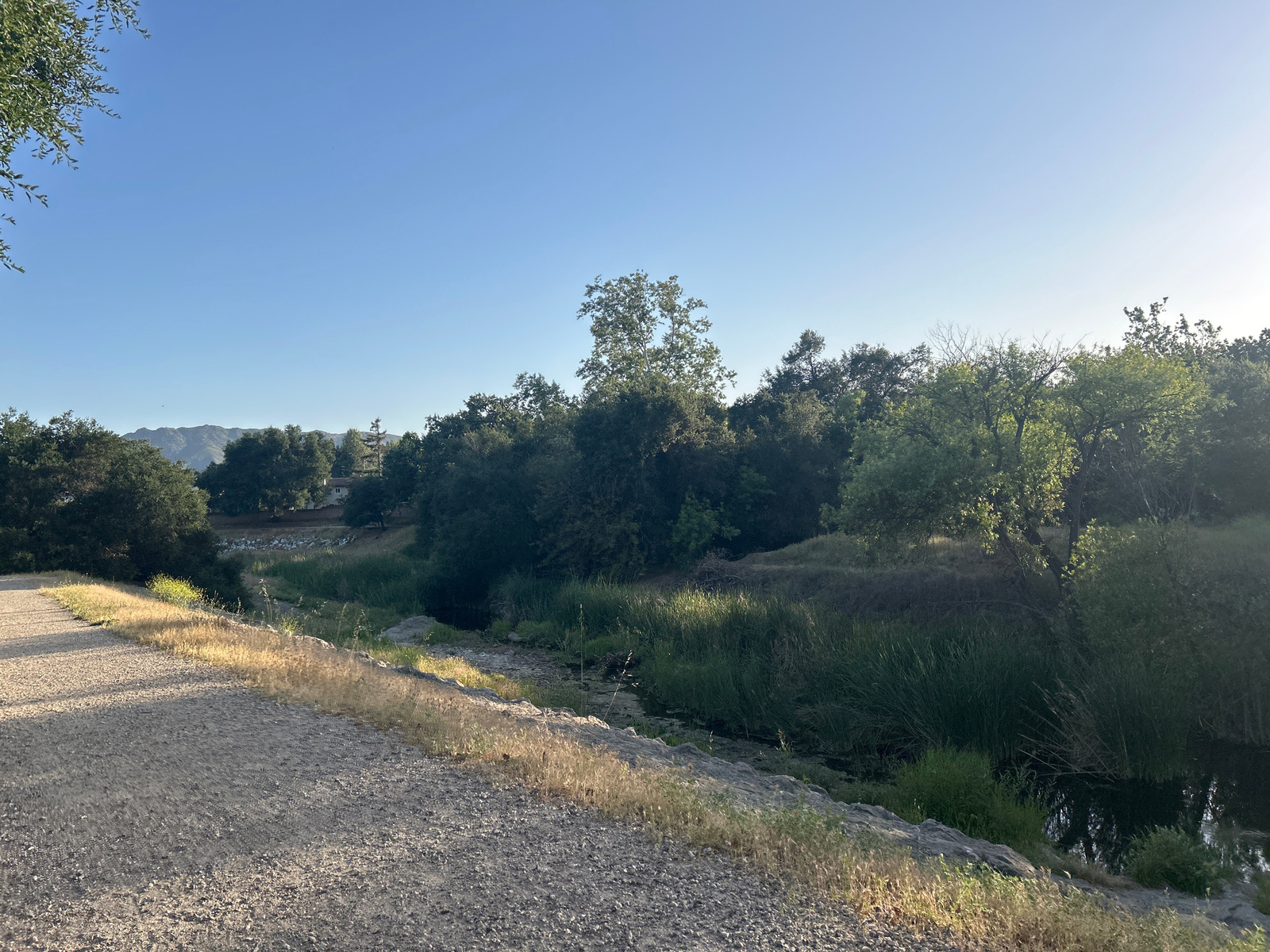 The image displays a tranquil outdoor landscape, typical of a natural park or preserve, consistent with Oak Park, United States of America. In the foreground, a sunlit dirt or gravel path slopes gentl…read more