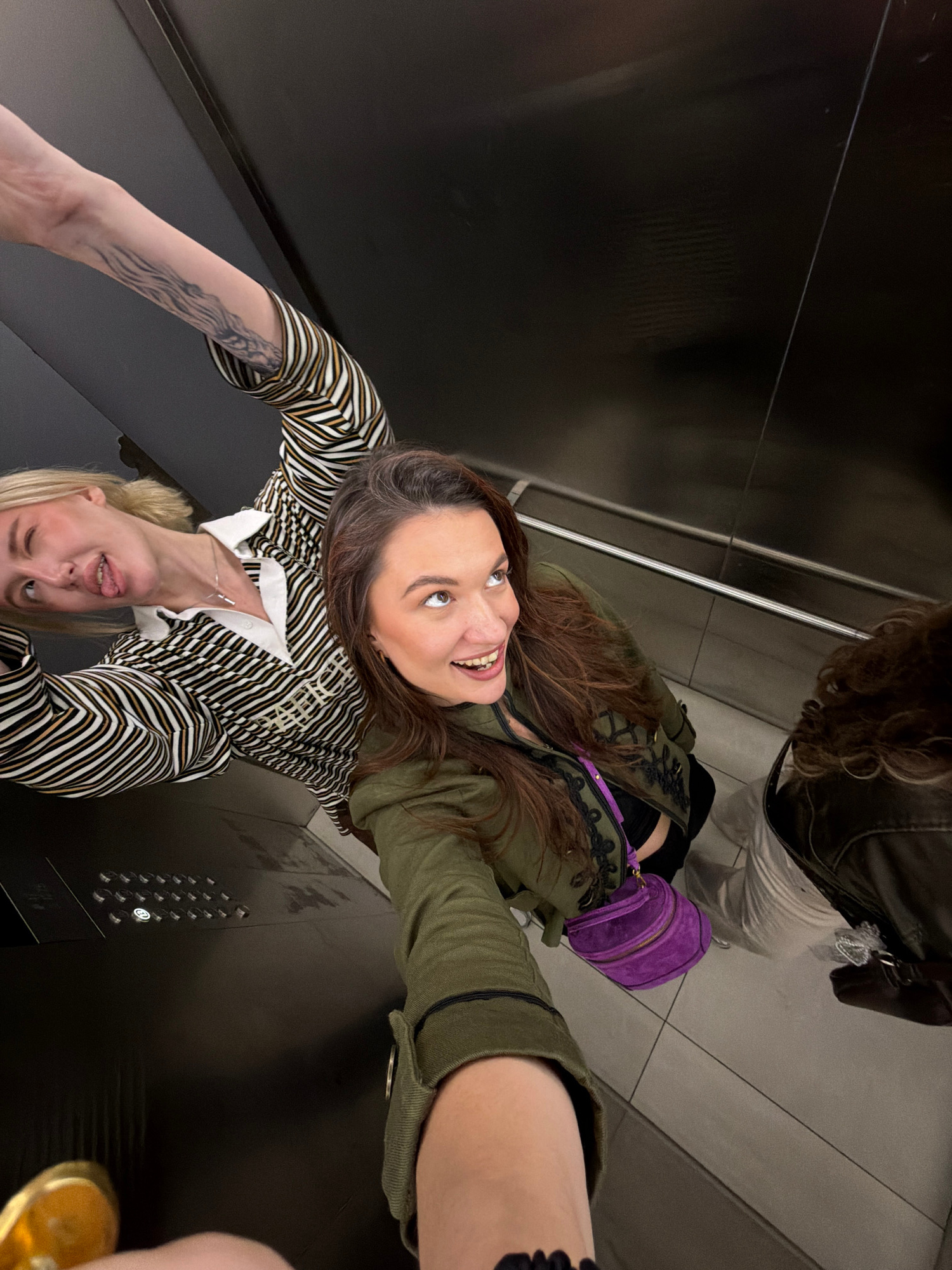 Two women stand in an elevator, as seen from a slightly elevated, angled perspective. The woman at the top of the frame has long, brown hair and is wearing a green jacket with black trim over a top wi…read more