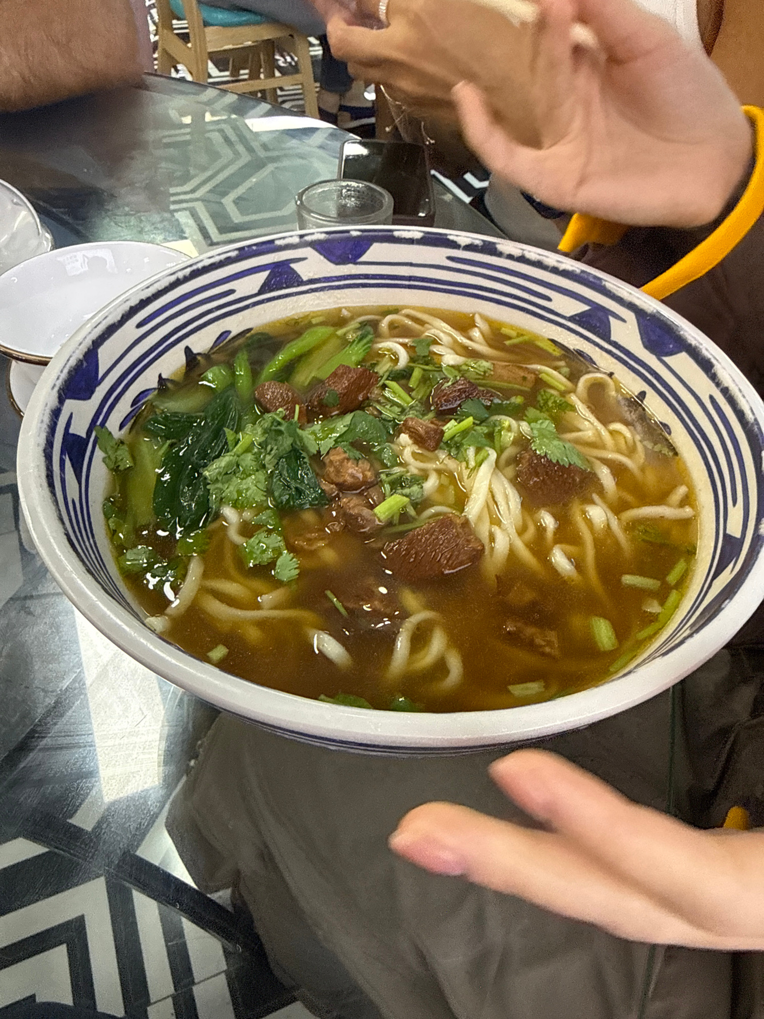 A high-angle shot depicts a bowl of beef noodle soup, held between two people's hands. The bowl is white with a blue patterned rim and contains noodles, green vegetables, cilantro, and chunks of beef…read more