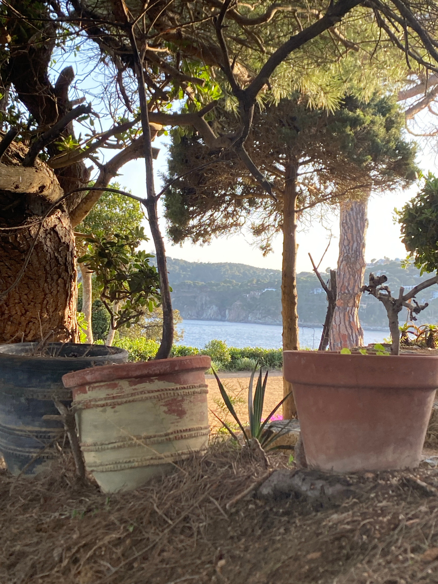 The image depicts a view from what appears to be a garden or natural area overlooking the Mediterranean Sea near Calella De Palafrugell, Spain. Foreground: Two large terracotta pots are visible. Oneβ¦read more