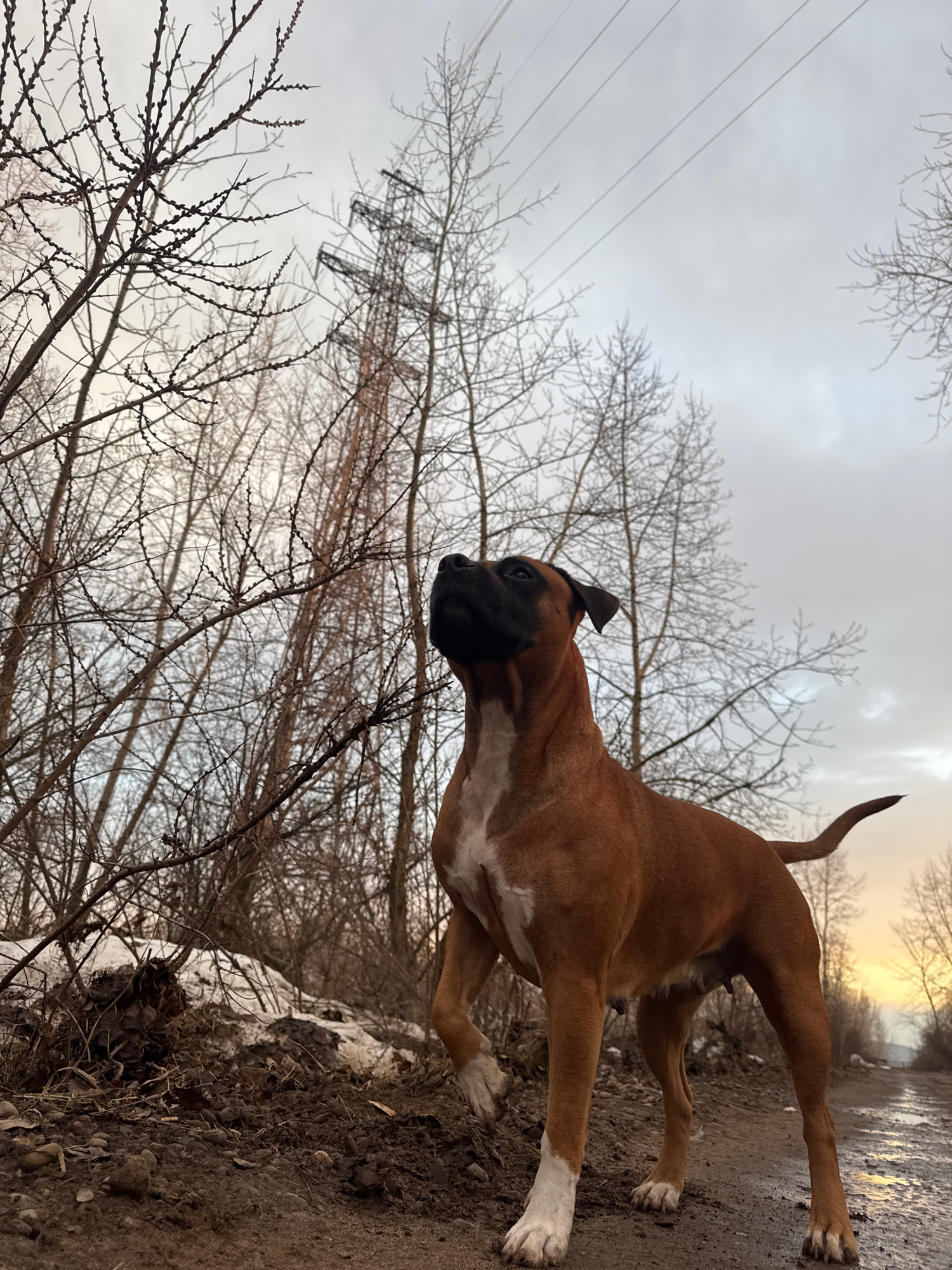 A low-angle shot depicts a brown and white boxer dog standing on a dirt path in Chaikovsky, Russia. The dog is the primary subject, its black nose and ears contrasting with its light brown coat. The s…read more