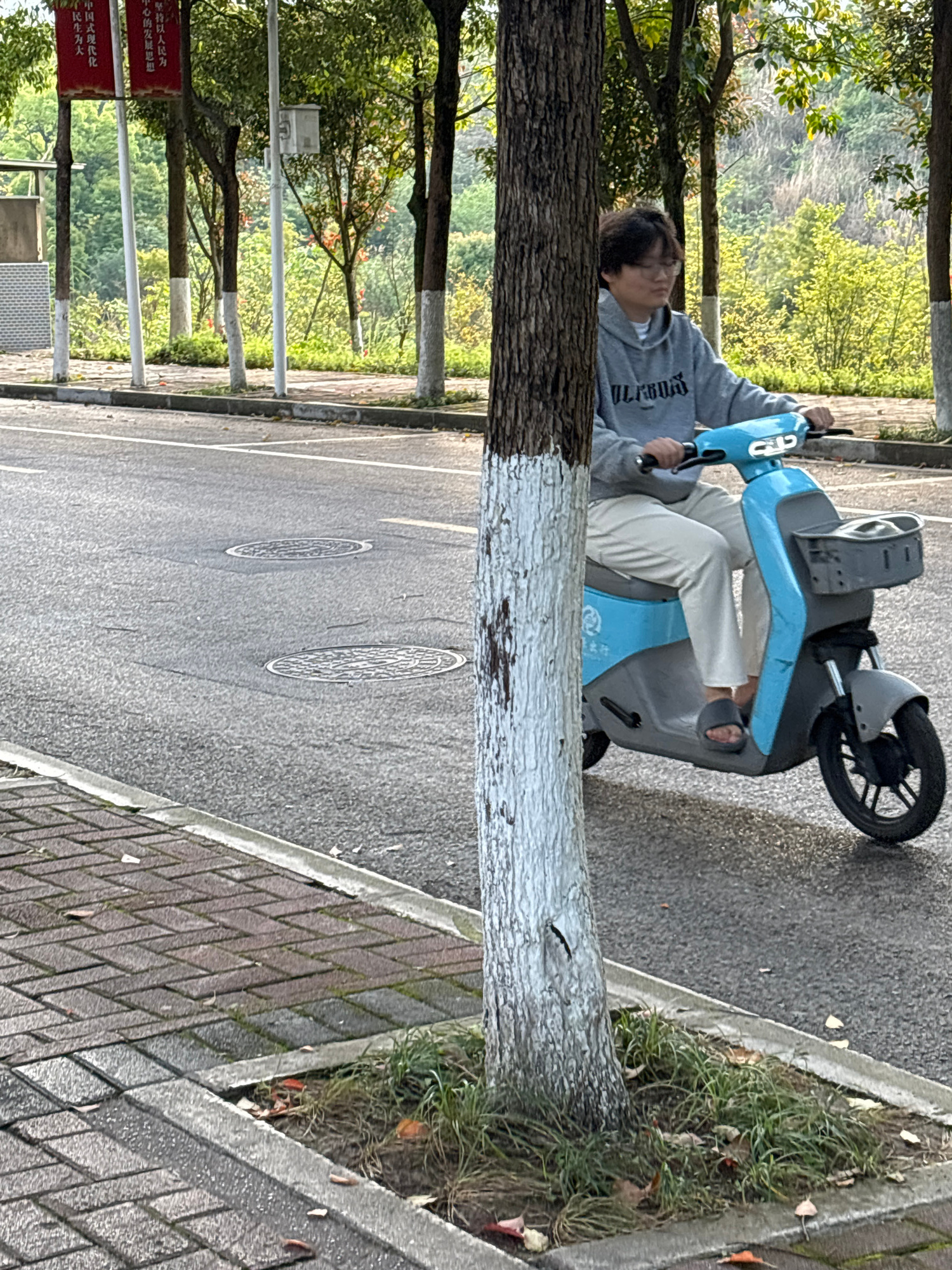 A young person is seated on a light blue electric scooter parked on an asphalt road. The person is wearing a gray sweatshirt with the word "VERSUS" printed on it and white pants. A tree trunk, painted…read more