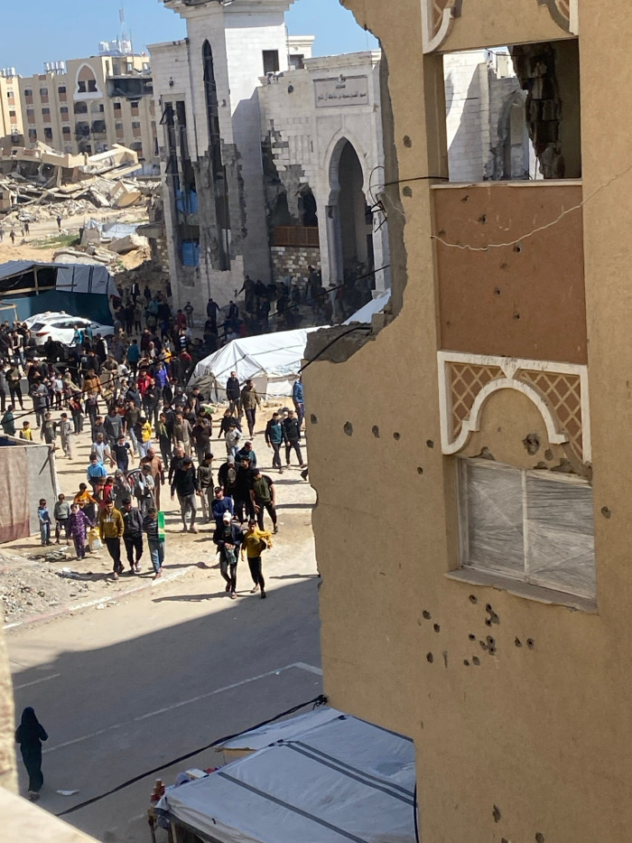 The image depicts a scene of extensive urban destruction in Khan Yunis, Palestinian Territory, under a clear blue sky. In the foreground, the right side is dominated by a severely damaged multi-story…read more