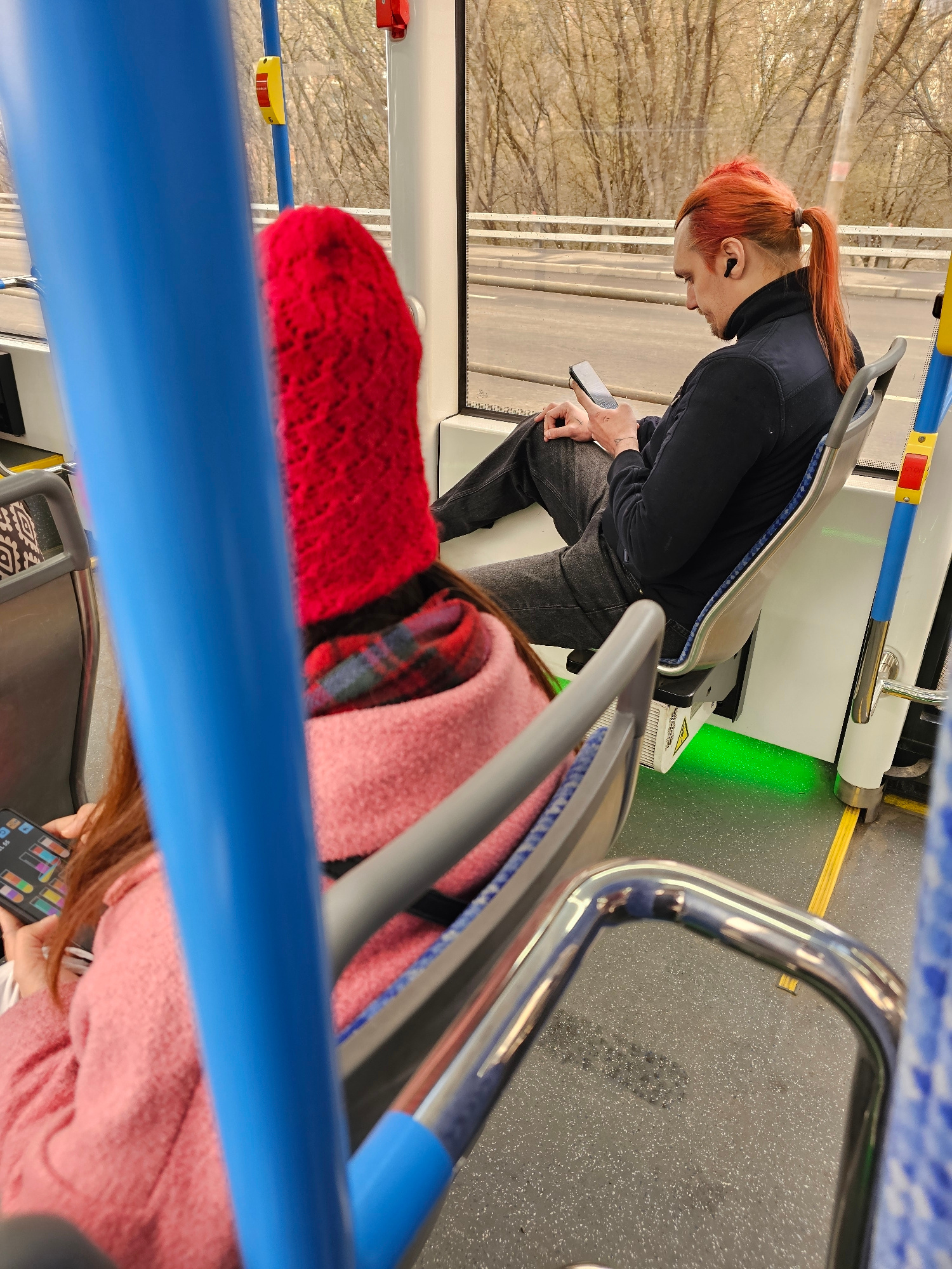On a bus, a person with orange hair tied in a ponytail is looking at a smartphone in their hands. They are wearing a black jacket and gray jeans. Another person is sitting in the foreground, wrapped i…read more