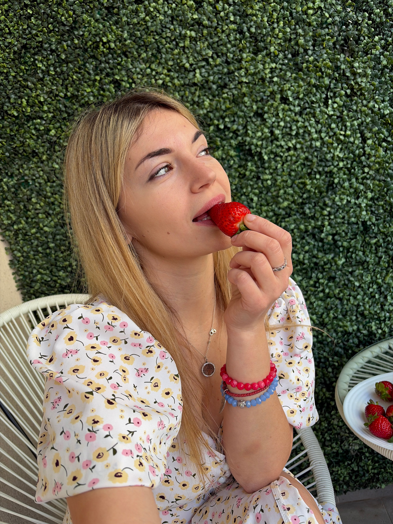 A woman with long blonde hair, wearing a white floral dress, is seen in an eye-level, candid shot, holding a strawberry to her lips. She is seated on a white, rounded chair with a latticed design. Her…read more