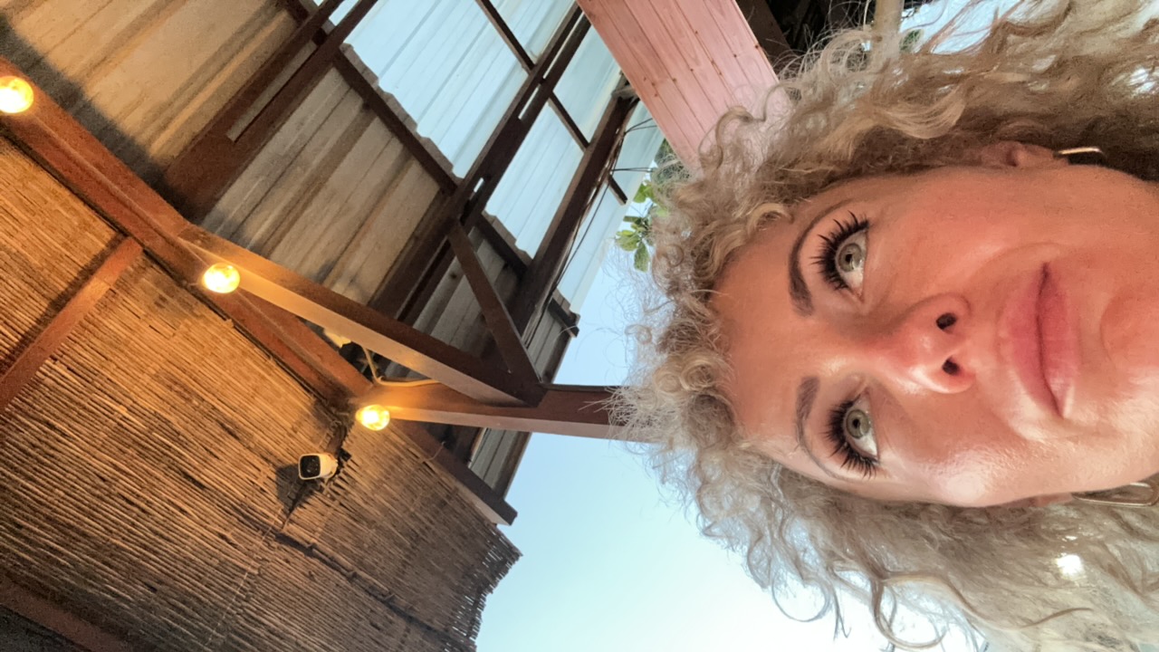Here's a forensic description of the image: The image captures a daytime outdoor dining scene, likely at a cafe or restaurant. The primary subject is a plated breakfast dish: Eggs Benedict with green…read more