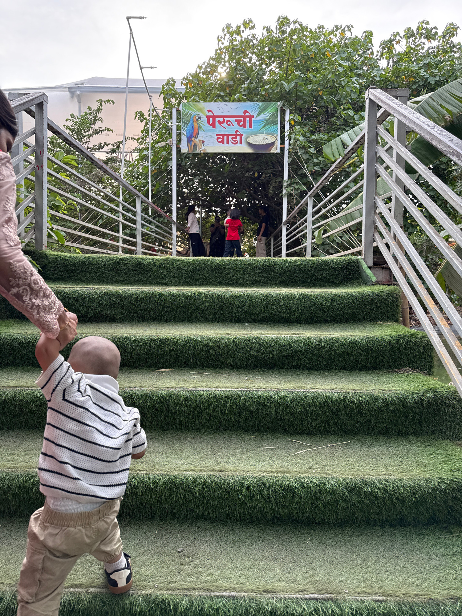 The image depicts a child being helped up a set of artificial grass-covered stairs, likely in Nashik, India, as evidenced by the sign in Marathi script. A woman in a lace-sleeved garment holds the chi…read more