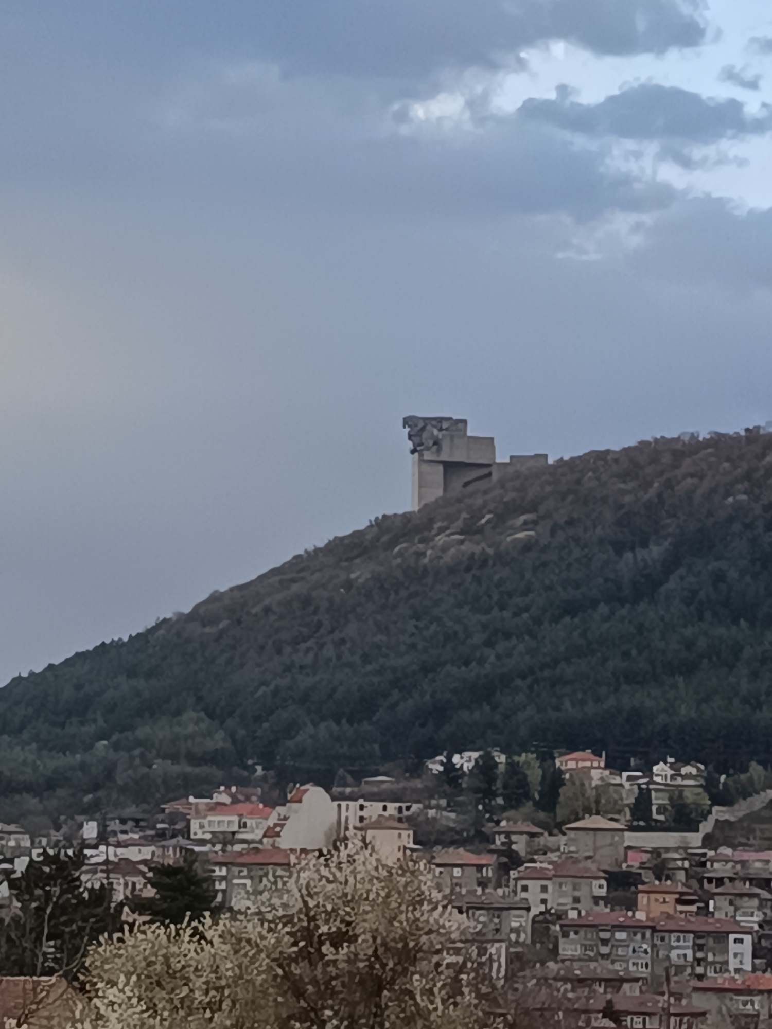 The image shows a cityscape in Shumen, Bulgaria, with the Monument to 1300 Years of Bulgaria atop a forested hill in the background. The sky is overcast with grey and white clouds. The monument is a c…read more