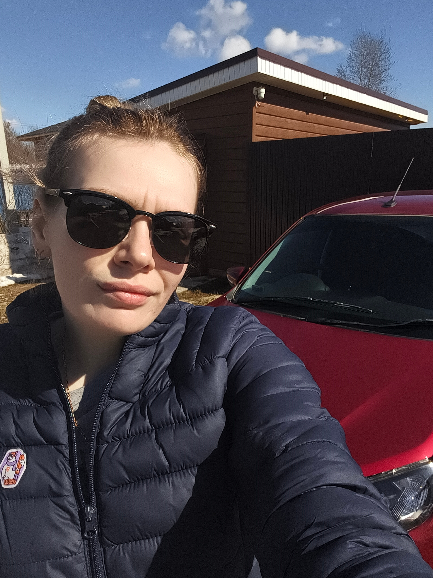 A fair-skinned woman with her hair in a bun and sunglasses poses for a selfie. She is wearing a dark blue puffy jacket with a small, colorful patch on the left side. Behind her is a red car and a wood…read more