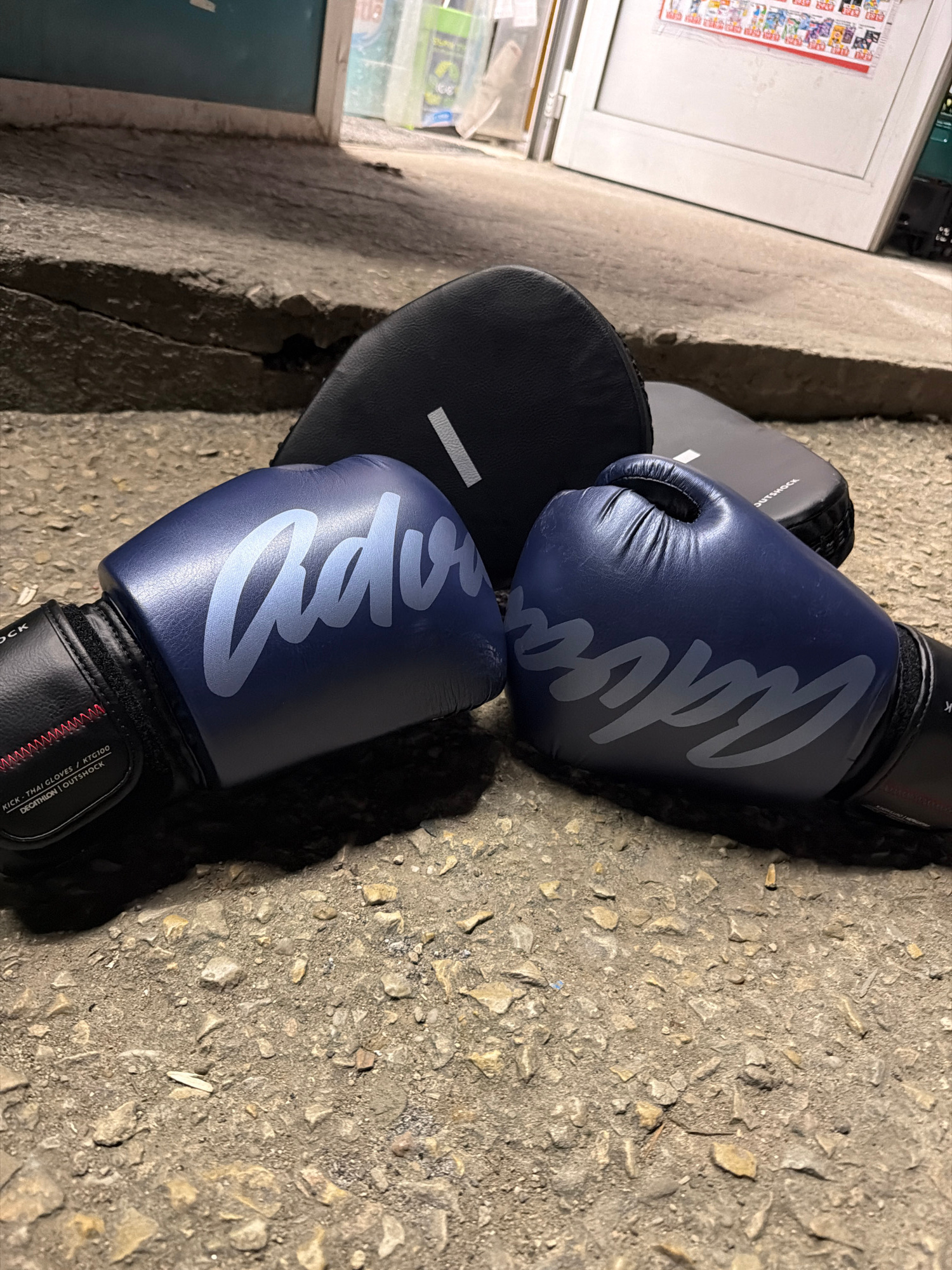 The image shows a pair of navy blue "Adidas" boxing gloves resting on a black striking pad. The gloves are scuffed. The striking pad is partially obscured. The equipment is resting on a rough, concret…read more