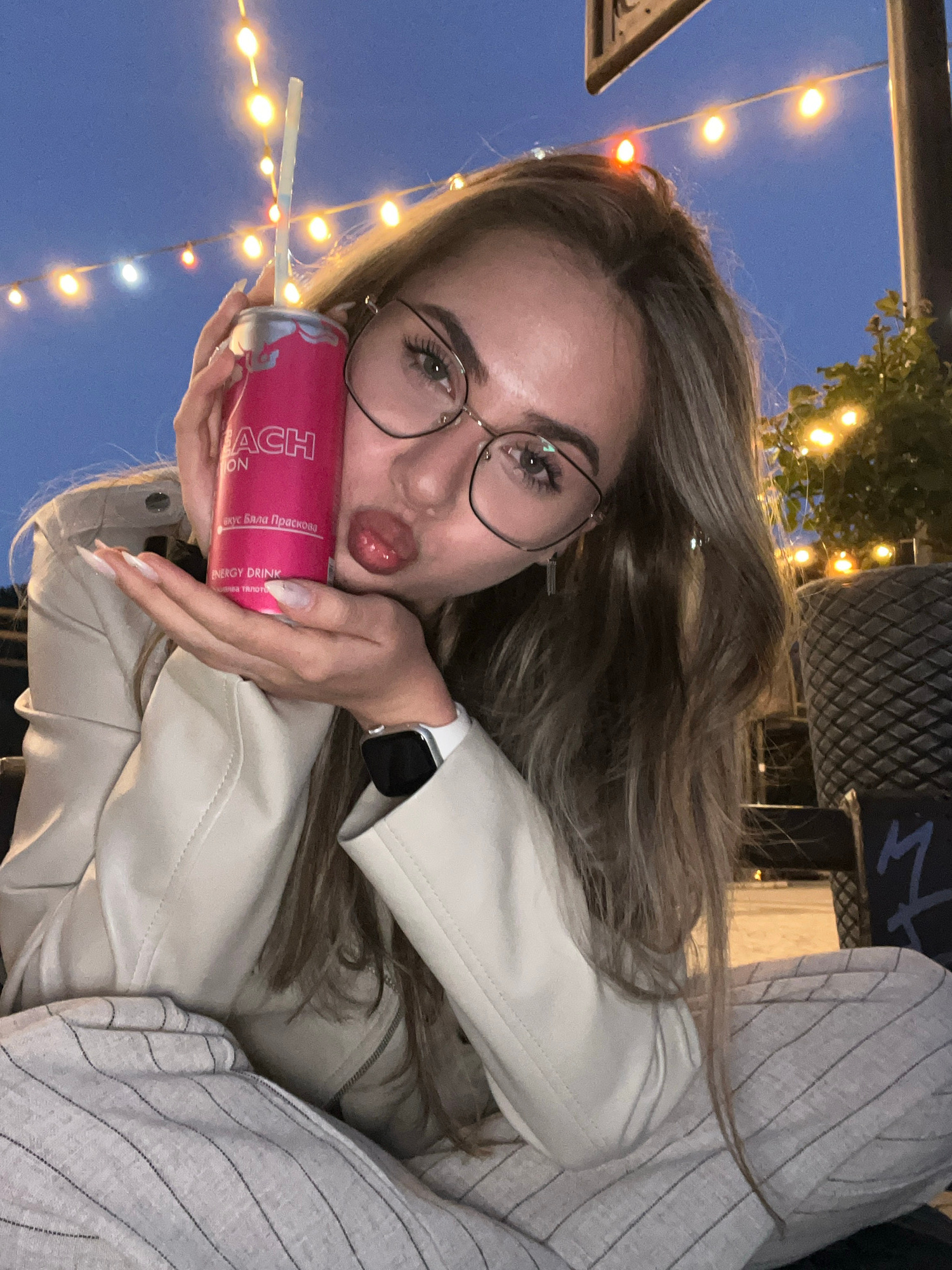A young woman with long brown hair and glasses is holding a pink energy drink, likely a Red Bull peach edition based on the Cyrillic writing on the can. She's wearing a light-colored jacket and a stri…read more