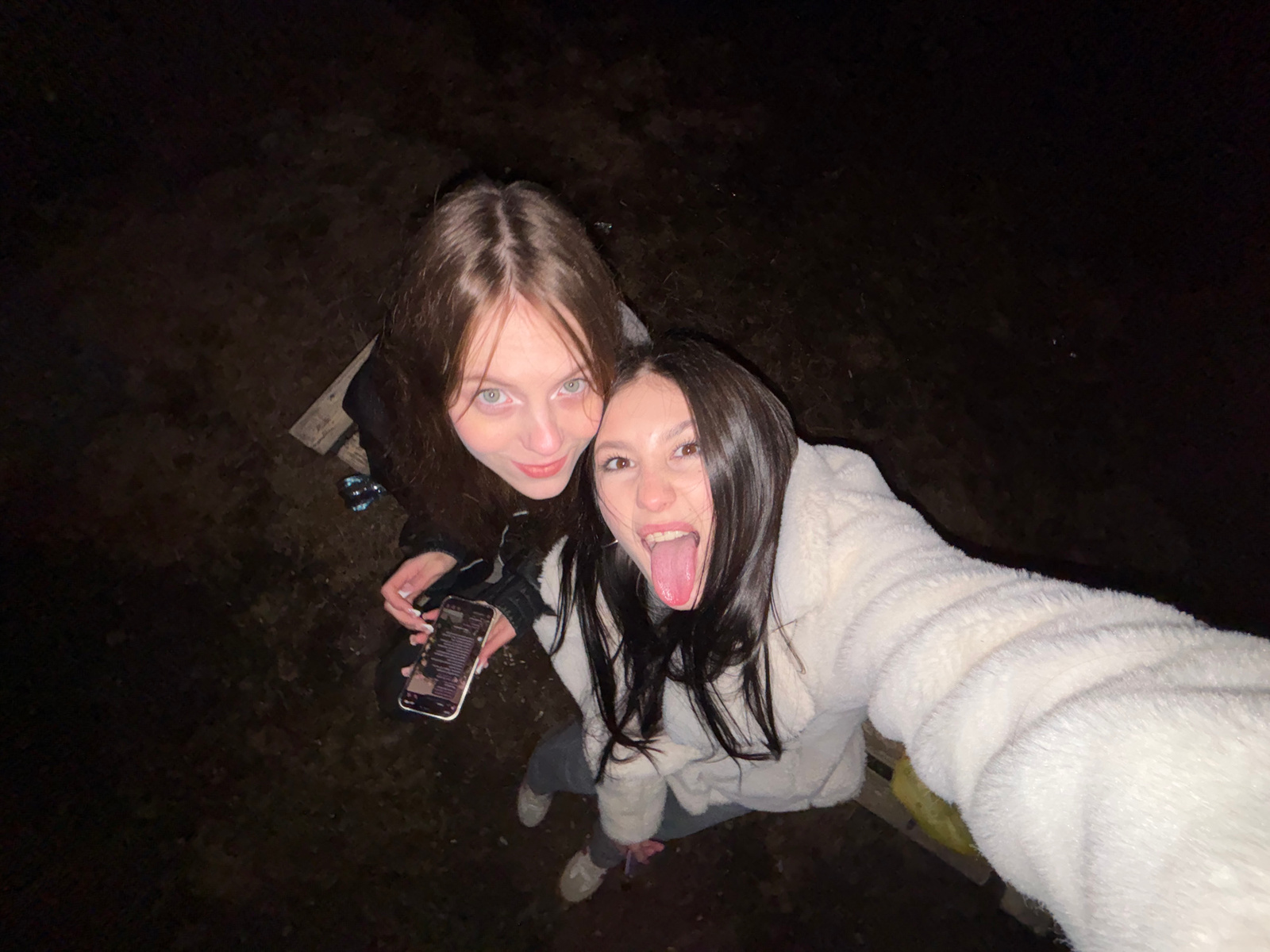 Two young women are taking a selfie outdoors at night. The woman on the left has light brown hair and green eyes, and is holding a phone with a lit screen. The woman on the right has long dark hair an…read more