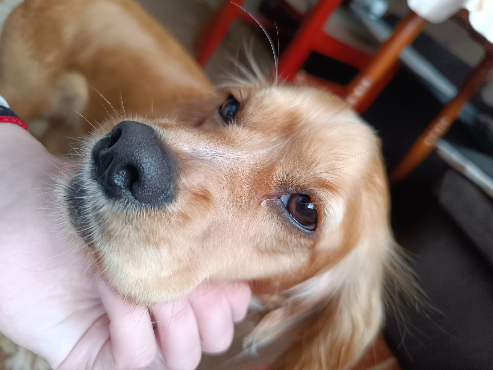 A close-up shot focuses on a light brown dog with long ears, likely a Spaniel breed. A human hand, with a red and black bracelet visible, gently cups the dog's face near its nose. The dog has a black…read more
